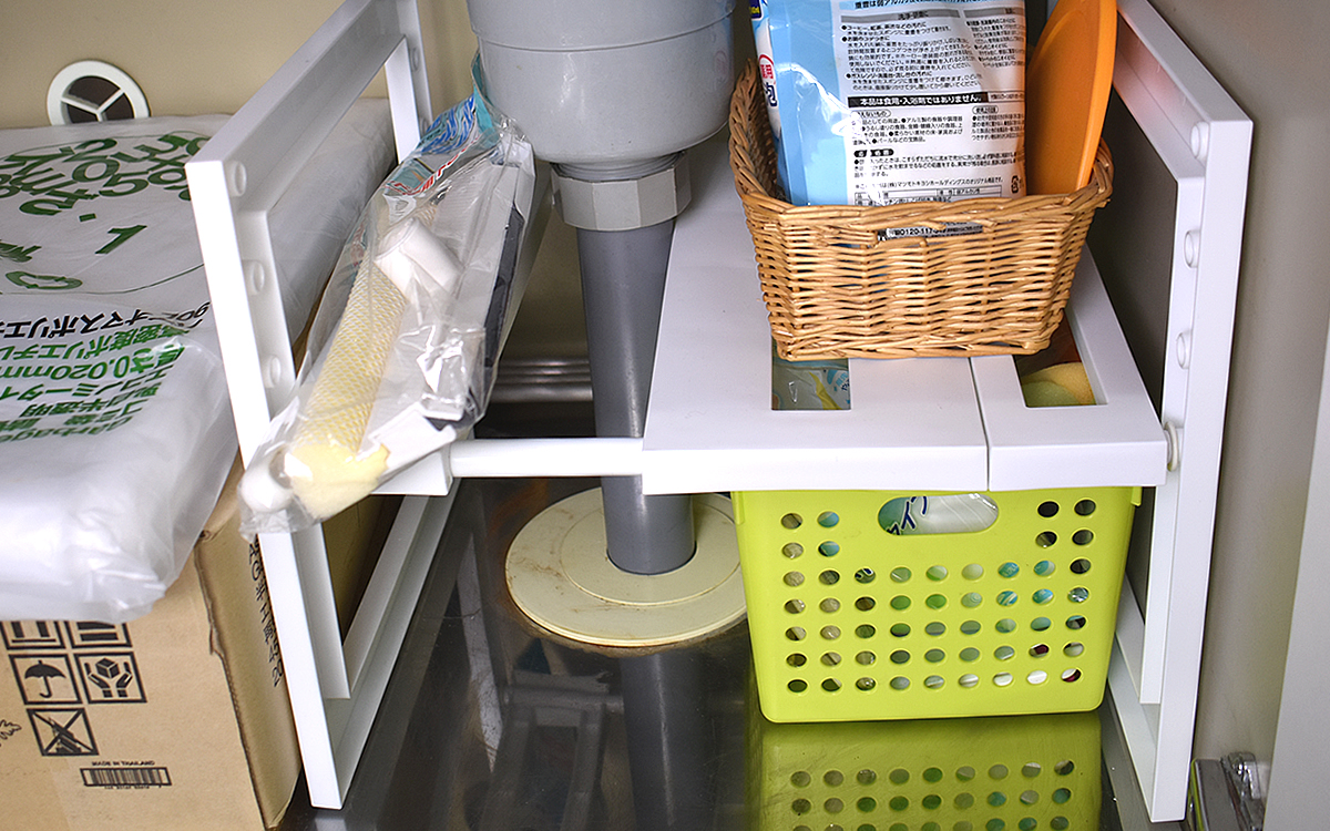 排水トラップに邪魔されず、収納スペースの有効活用を叶える「伸縮フリーラック クラネ」。同商品を使えば、きっとあなたも収納上手の仲間入りです!