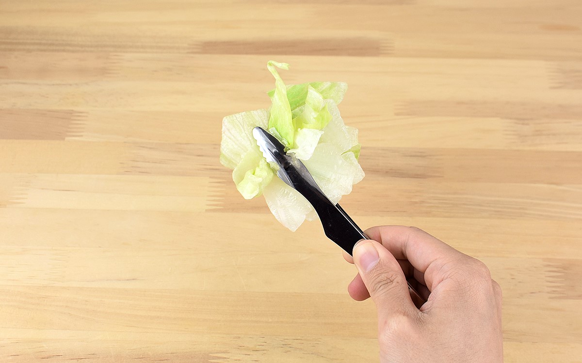 さっそくトングで野菜を持ってみたところ、全然力を入れなくてもモノが掴めて楽々。少しの力でしっかり食材が固定されるため、葉を複数枚掴んでも落ちそうになることはありませんでした。またトングの長さが短いため、小さいモノでも狙いを定めやすい印象。細かなモノを掴むのが苦手な不器用さんにもうってつけの商品です。
