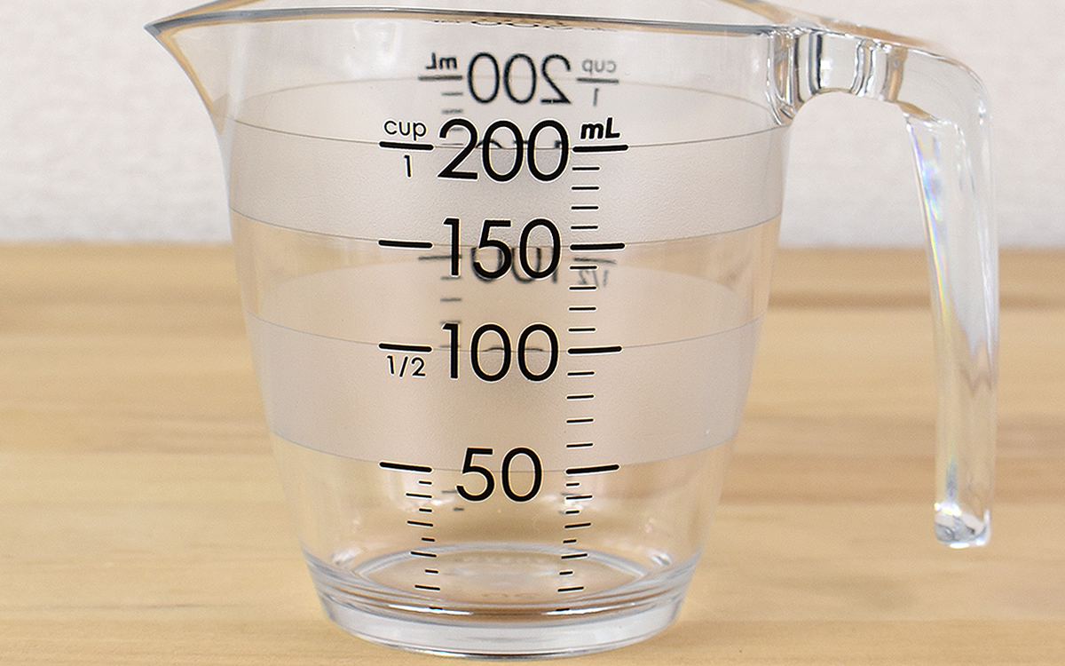 約11.6(幅)×7.8(奥行)×8.6cm(高さ)の同商品を手に持ってみると、黒字の目盛りが程よいサイズ感でとても見やすい印象。また計量線はcupの単位を計れる仕様に。50~100mLと150~200mLの部分にラインが引かれているので、何処から見ても手軽に1/4~1cupを計量できますよ。