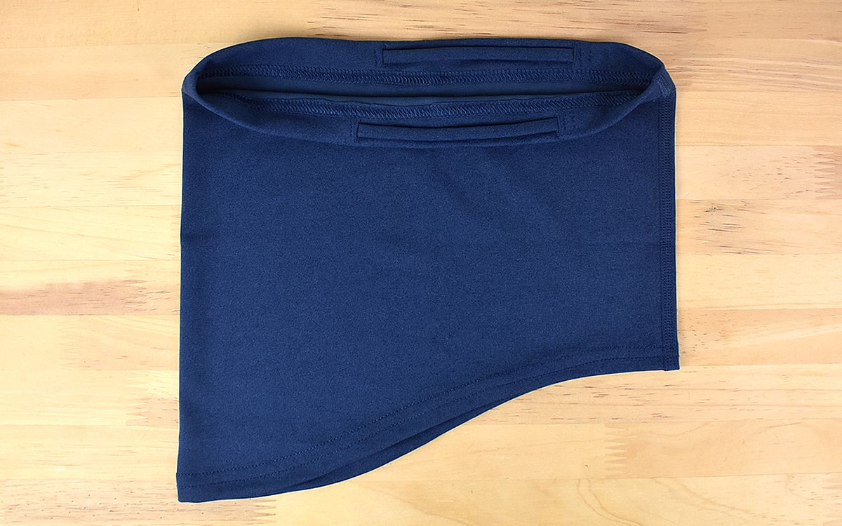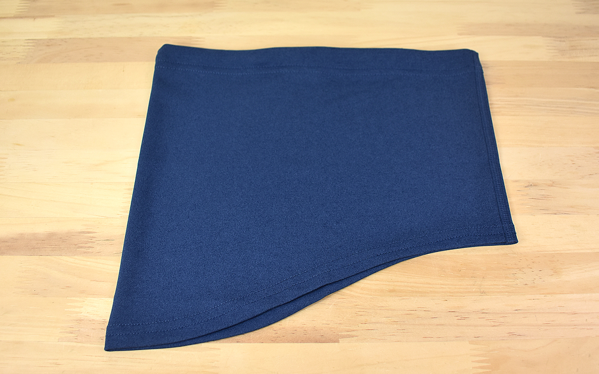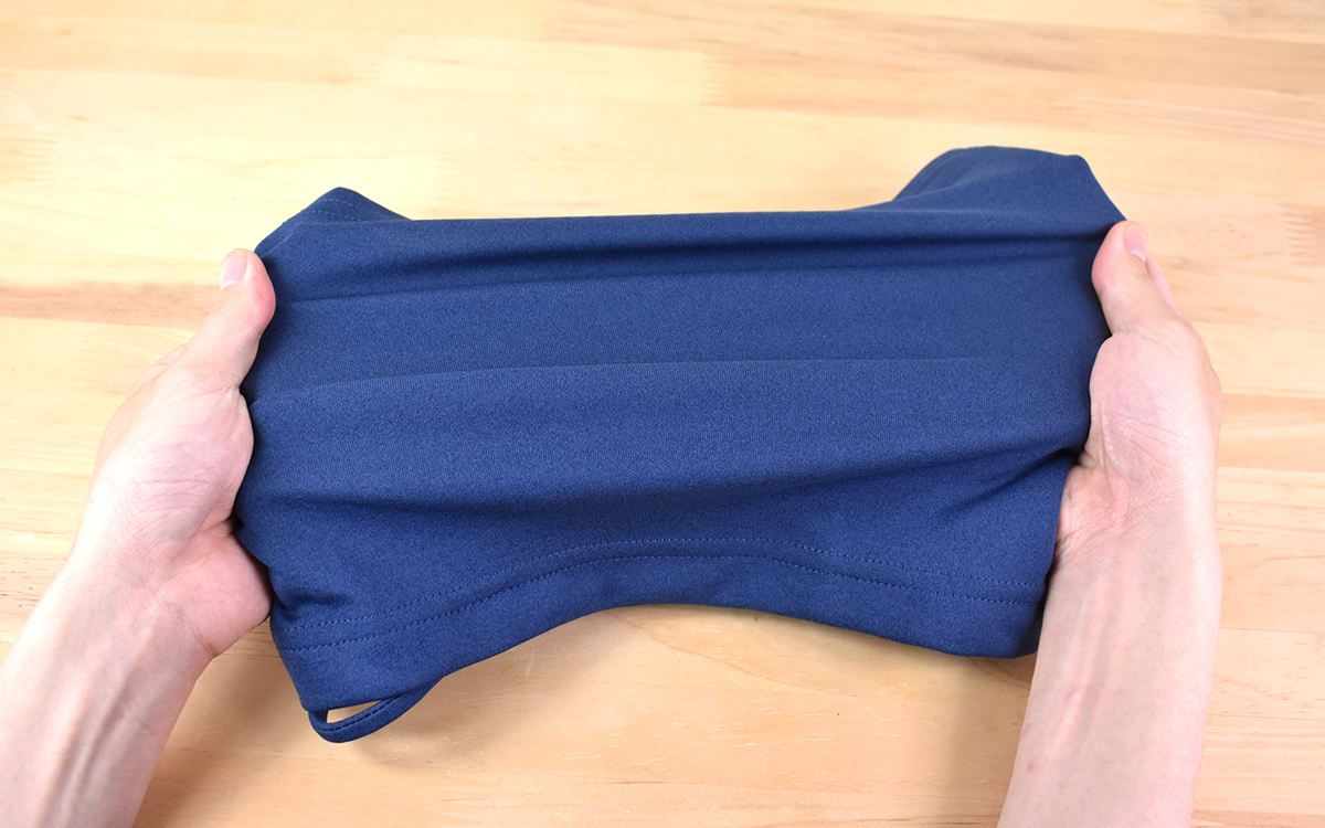 「ライトグレー」「黒」「ミントグリーン」「ネイビー」の全4色がある中で、今回購入したのはネイビーのネックゲイター。大きさは27×28.5cmで、素材はポリエステル100%です。生地の手触りはすべすべしており、生地そのものも薄め。重さに関してはパッケージに記載されていませんが、持ってみた印象は一般的なマスクと同じくらいの重さでした。