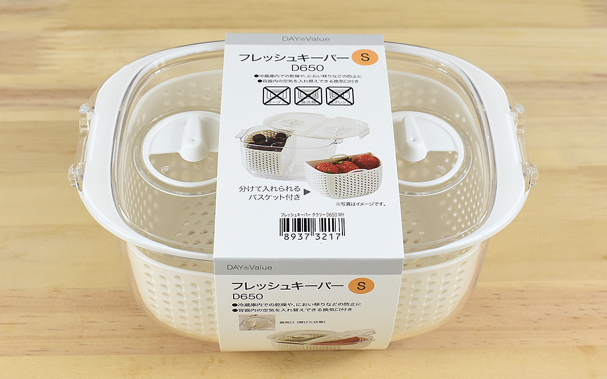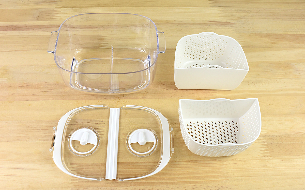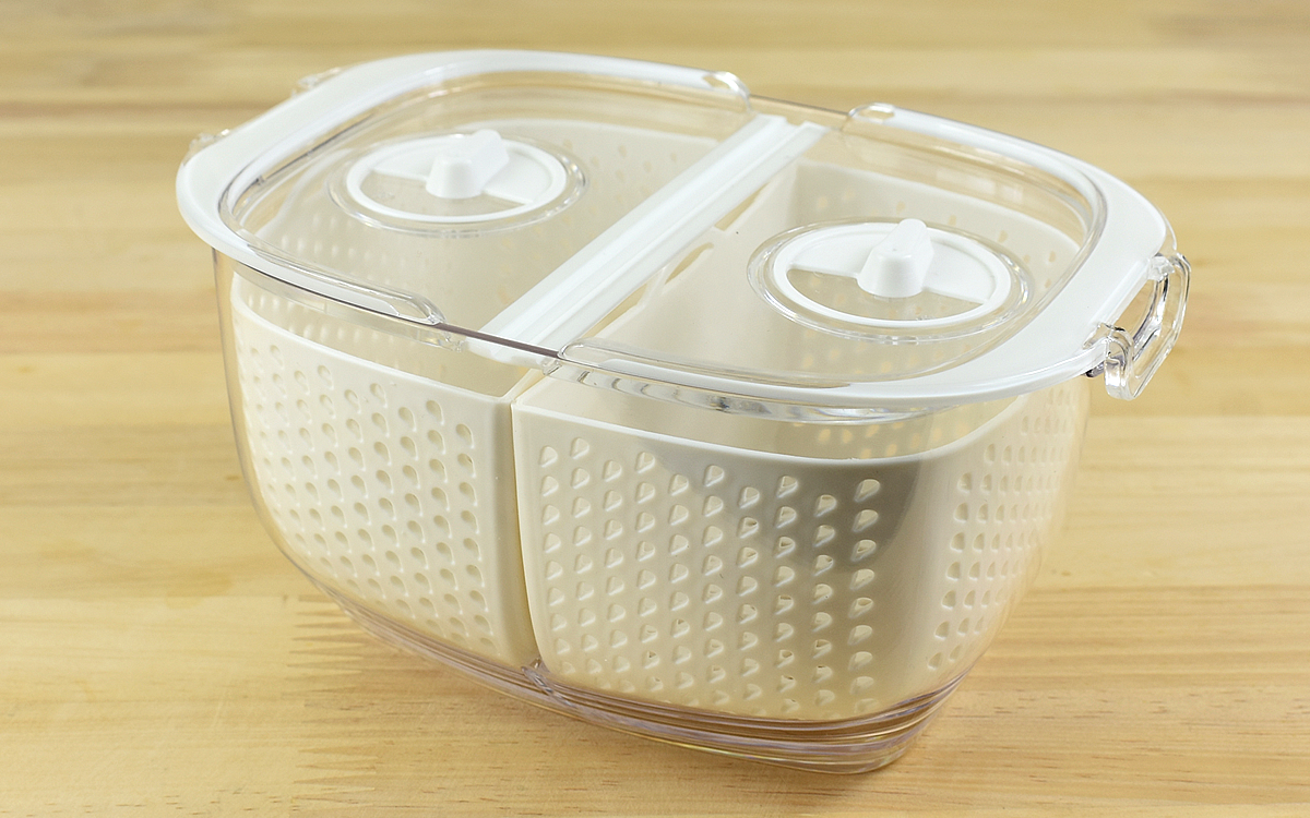 透明の容器の中に、穴が開いているバスケットが2つ入った同商品。Sサイズは大きさ約15.8(幅)×10.8(奥行)×8.2cm(高さ)ほどとコンパクトで、冷蔵庫に入れていても場所を取りません。中身も見えやすいため、迷うことなくパっと欲しい食材を取り出せます。