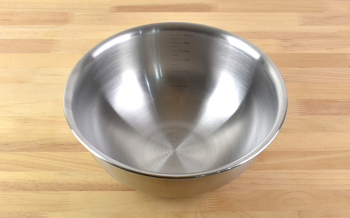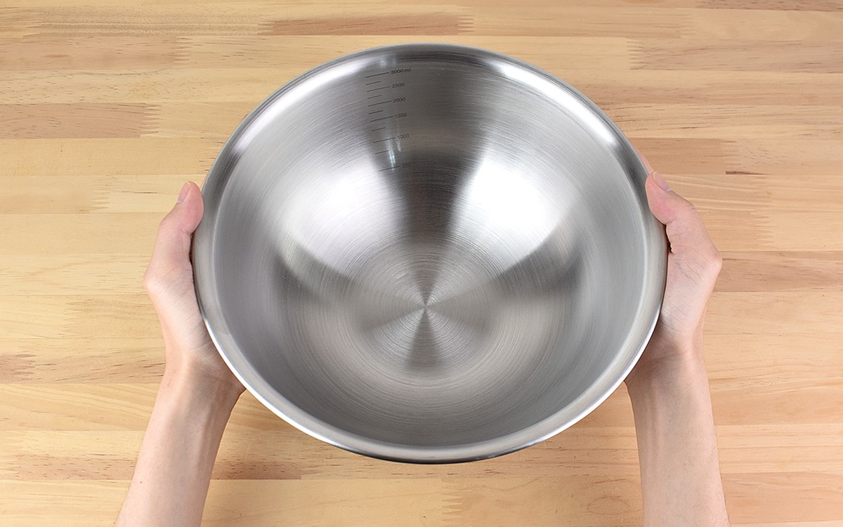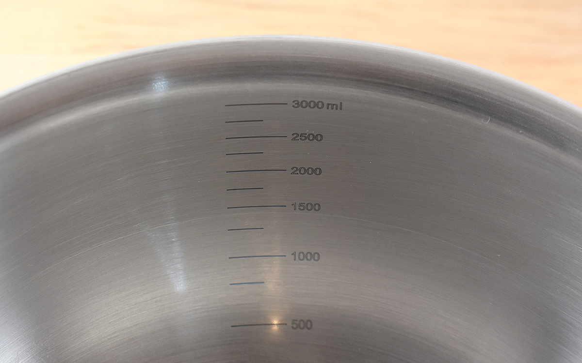 最大の特徴は底面のシリコンコーティング。ゴム状の底面は滑りにくく、ボウルがズレて床に落ちてしまう心配がありません。さらにボウルの内側には500~3000mlまでの目盛りつき。いちいち計量カップを出さなくても分量がわかり、料理の時短に繋がります。