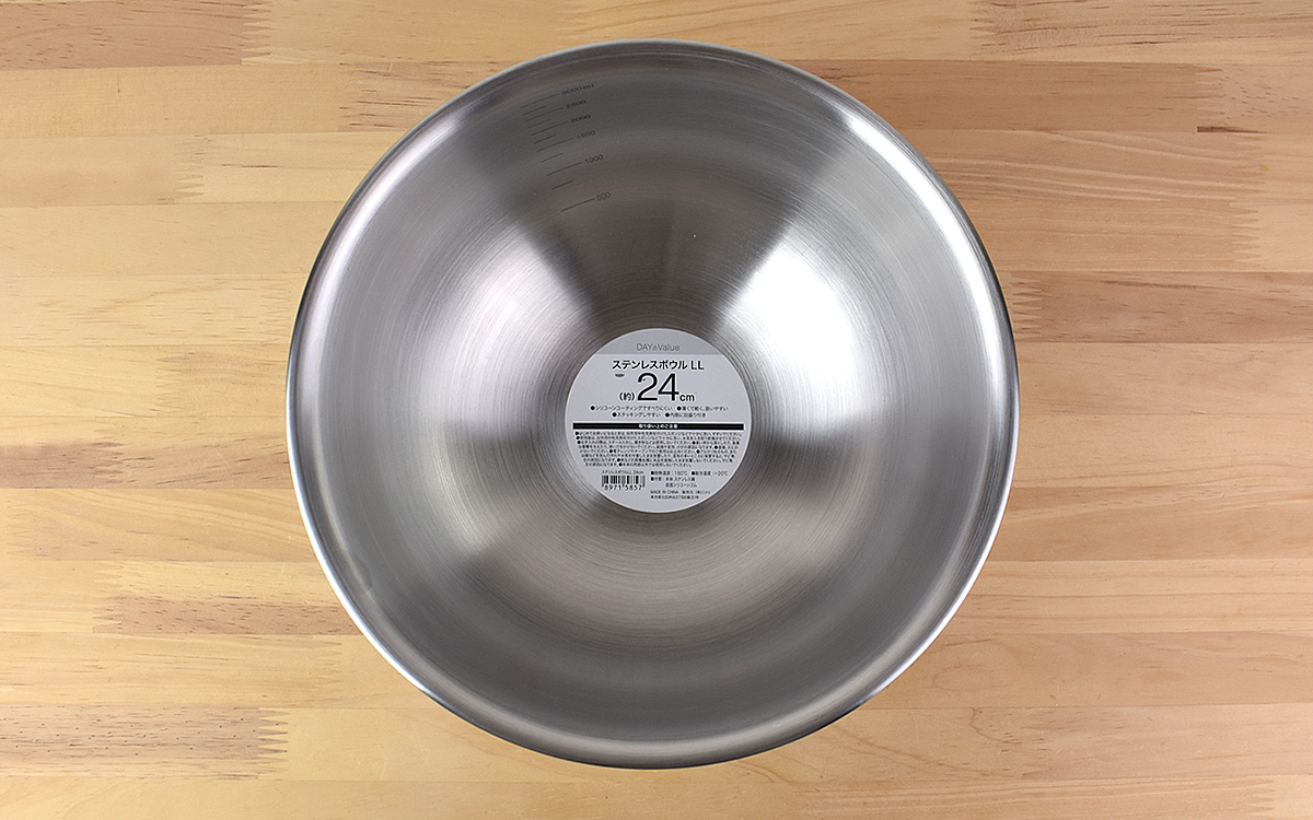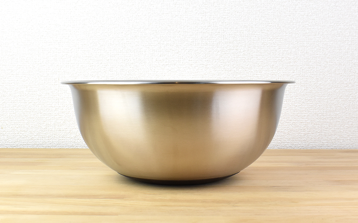 ステンレス鋼製の「ノンスリップボウル」は一見普通のボウルと変わらない見た目。しかし薄手の作りなので重さは約360gと軽く、誰でも扱いやすい重量です。大きさは約26(幅)×26(奥行)×10.5cm(高さ)とビッグサイズ。高さがある分、たっぷり材料を入れても周りを汚すことなく調理できますよ。