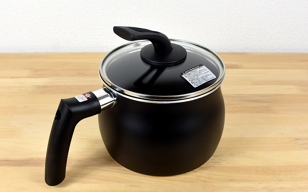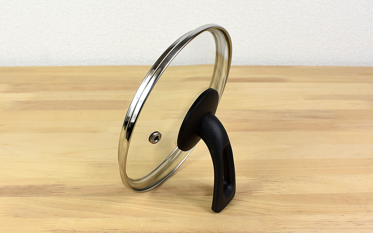 アルミニウム素材の本体は、大きさ約26(幅)×17.5(奥行)×20cm(高さ)ほど。ポットにはガラスふたと、麺茹でなどに便利なストレーナーが付属しています。特にガラスふたは持ち手部分が支えとなって自立し、より効率よく調理を進められますよ。
