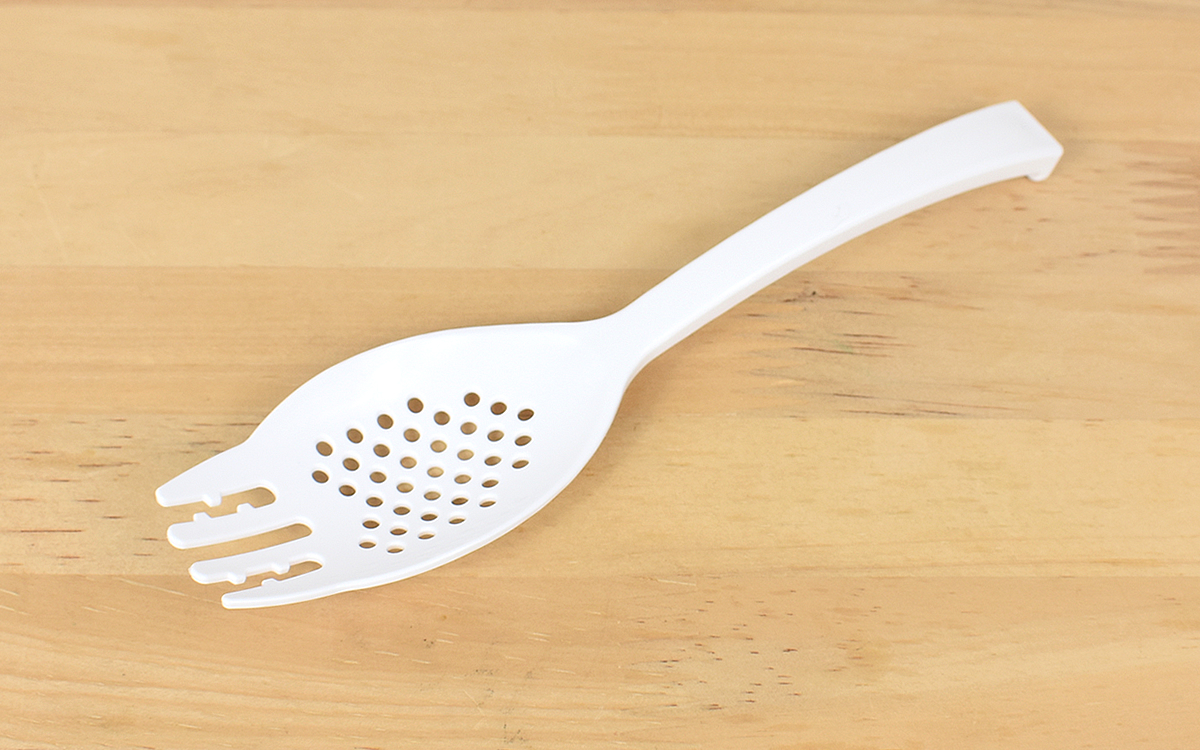穴あきラーメンレンゲの「スクーン」はポリプロピレン製で、重さはわずか9g。手にした印象はふわっと軽く、緩いカーブを描いた持ち手のおかげで違和感なく握ることができます。メレンゲといってもスプーン部分に無数の穴があいているほか、先端部分から飛び出したフォークも同商品の特徴の1つです。