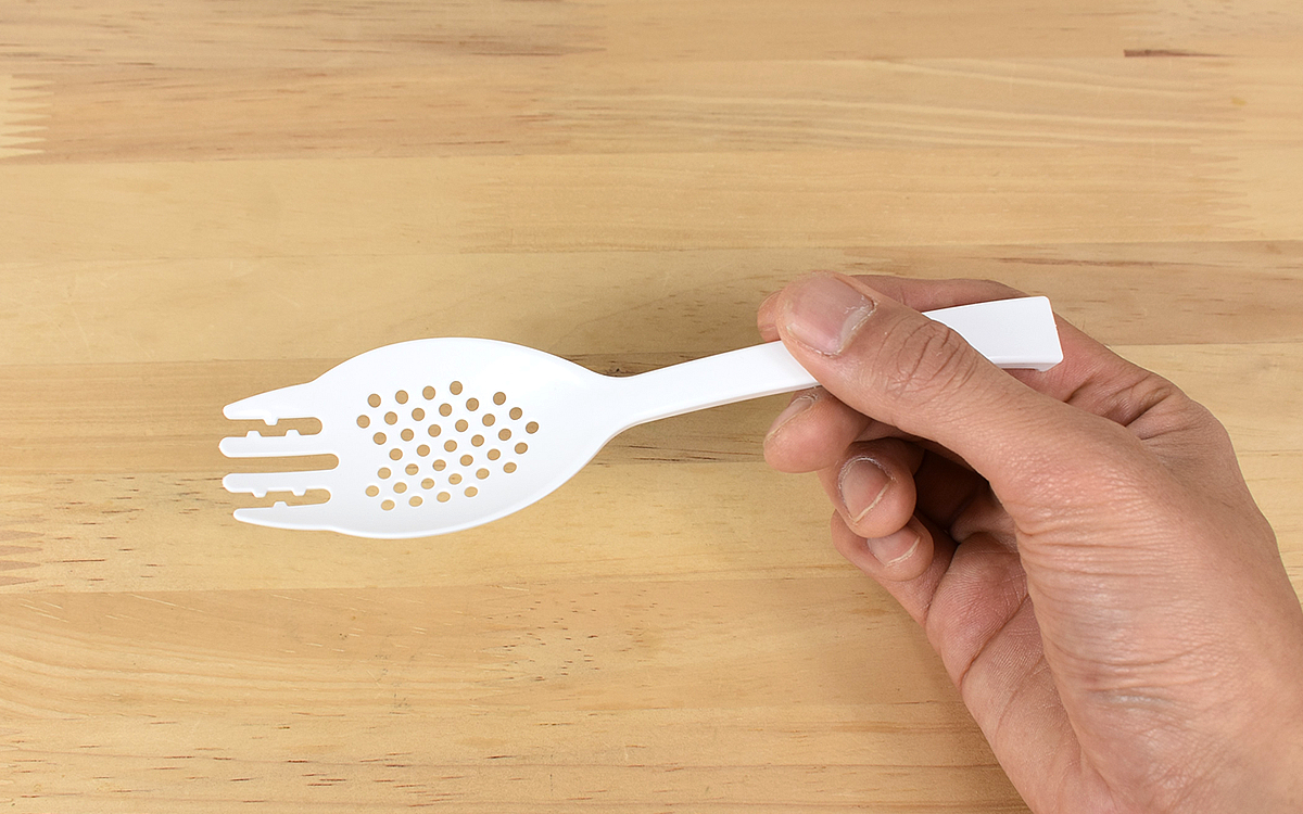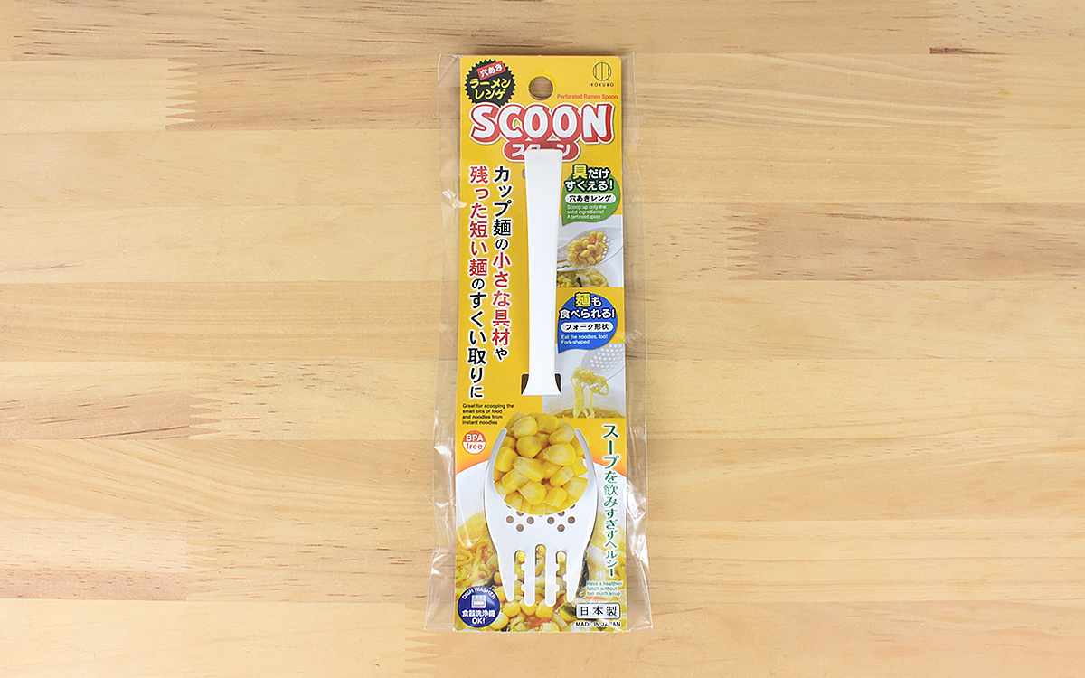 フォーク+スプーンの形状だけでも十分機能的ですが、さらに無数の穴が大活躍。従来のレンゲでは具材をすくうとスープまで口にしてしまいますが、「スクーン」は具材だけが残るかたちに。箸で1つ1つ具材をつまみ上げるよりも圧倒的に楽ちんで、食べ残しなくササっといただくことができました。