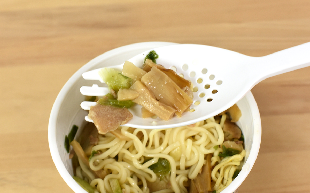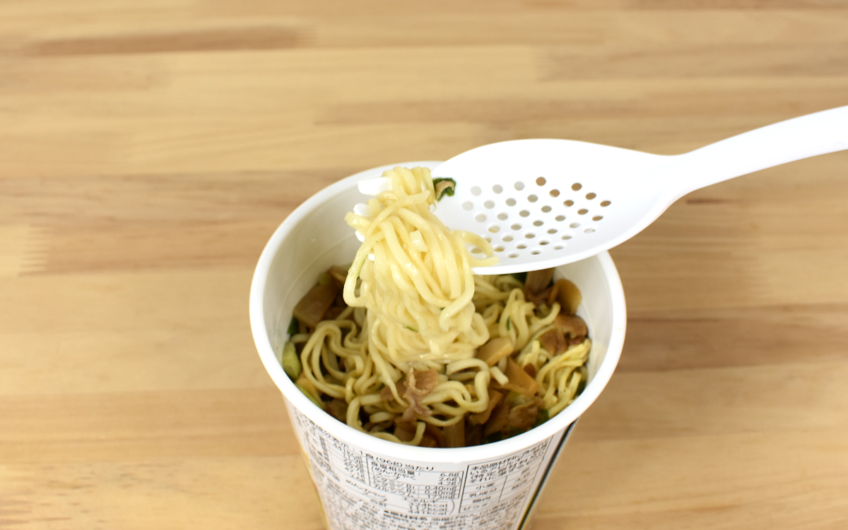 実際にカップ麺を用意して「スクーン」を使ってみたところ、まずはフォーク部分が大活躍。ご覧のとおり麺をまとめてすくい上げることができ、フォークの縁につけられたギザギザのおかげで麺がスルっとすべり落ちてしまう心配もありません。
