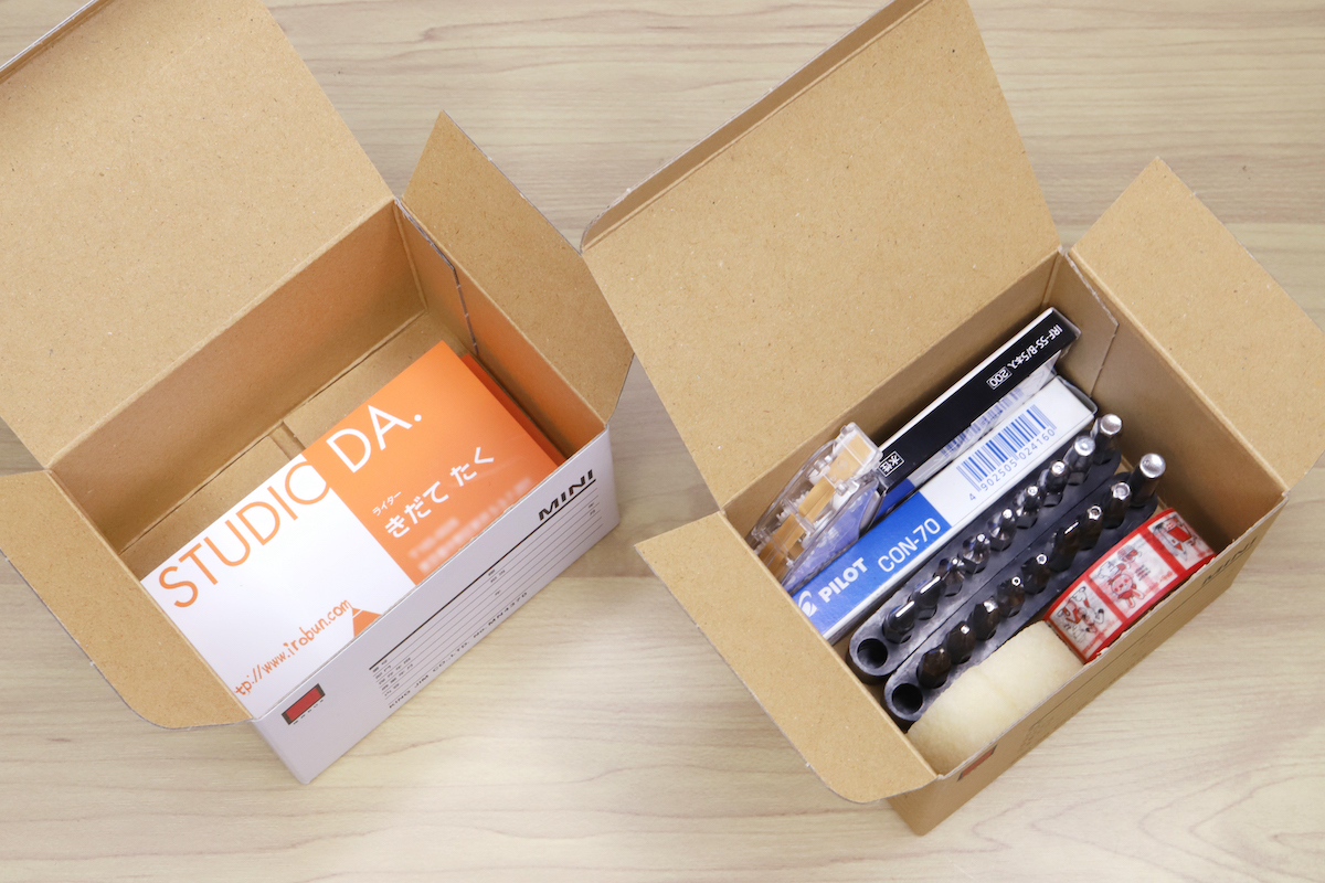 サイズは名刺がスッと入るぐらいで、机の上にあるちょっとした小物やお菓子類を放り込んでおくのに良さげ。そういった散らばりがちなものがまとめて片付くと、机がすっきり見えるし、なにより机に小さいダンボール箱が積まれてる、というビジュアルがグッとくるのだ。
