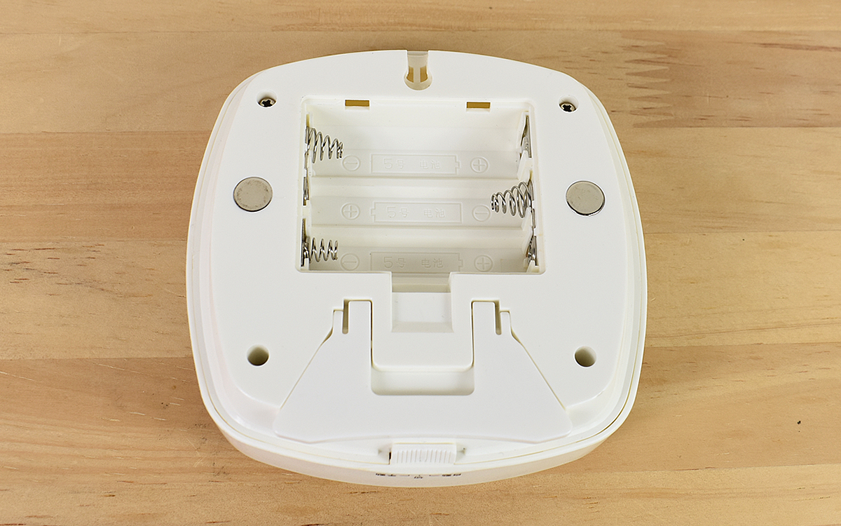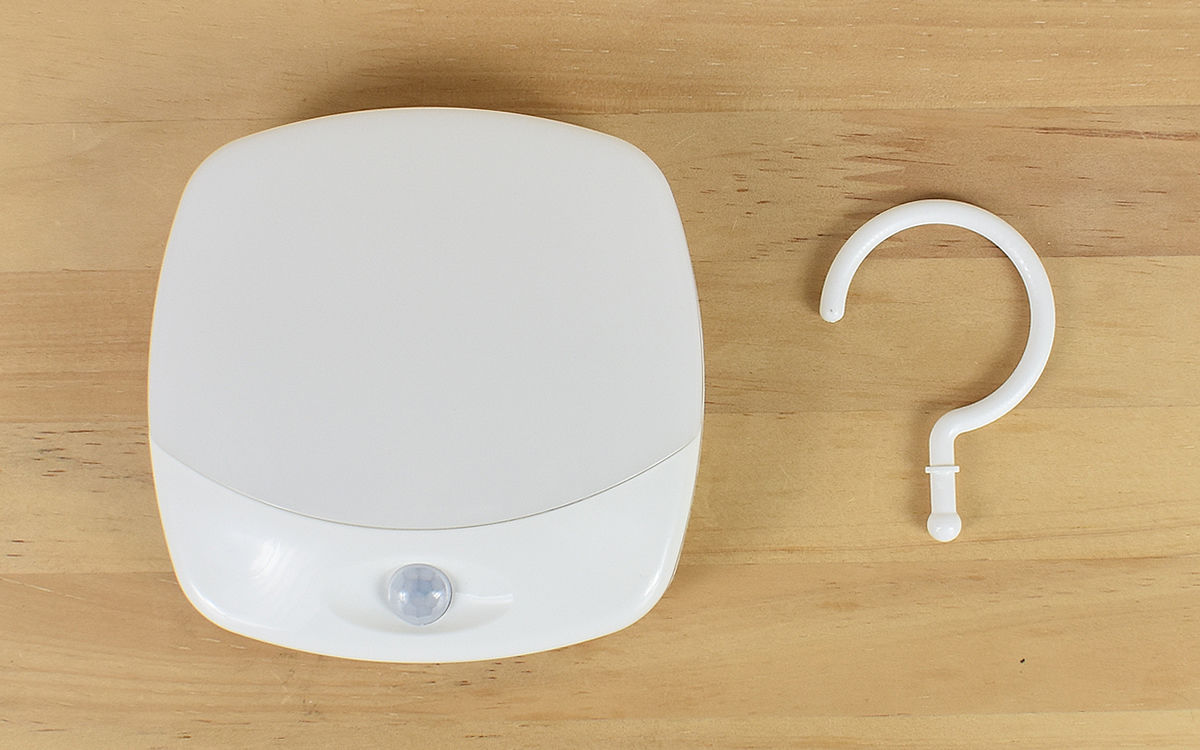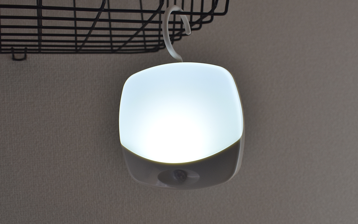 本体背面にはスタンドに加えて小さなマグネットが埋め込まれていて、思いのほか強い力でスチールにくっついてびっくり。また、スタンドやマグネットが使えない壁面にも、付属の両面テープを使って簡単に取りつけることができました。フックを併用すれば吊り下げ使用も可能なので、たとえばラック周辺を照らしたい時にぴったりですよ。