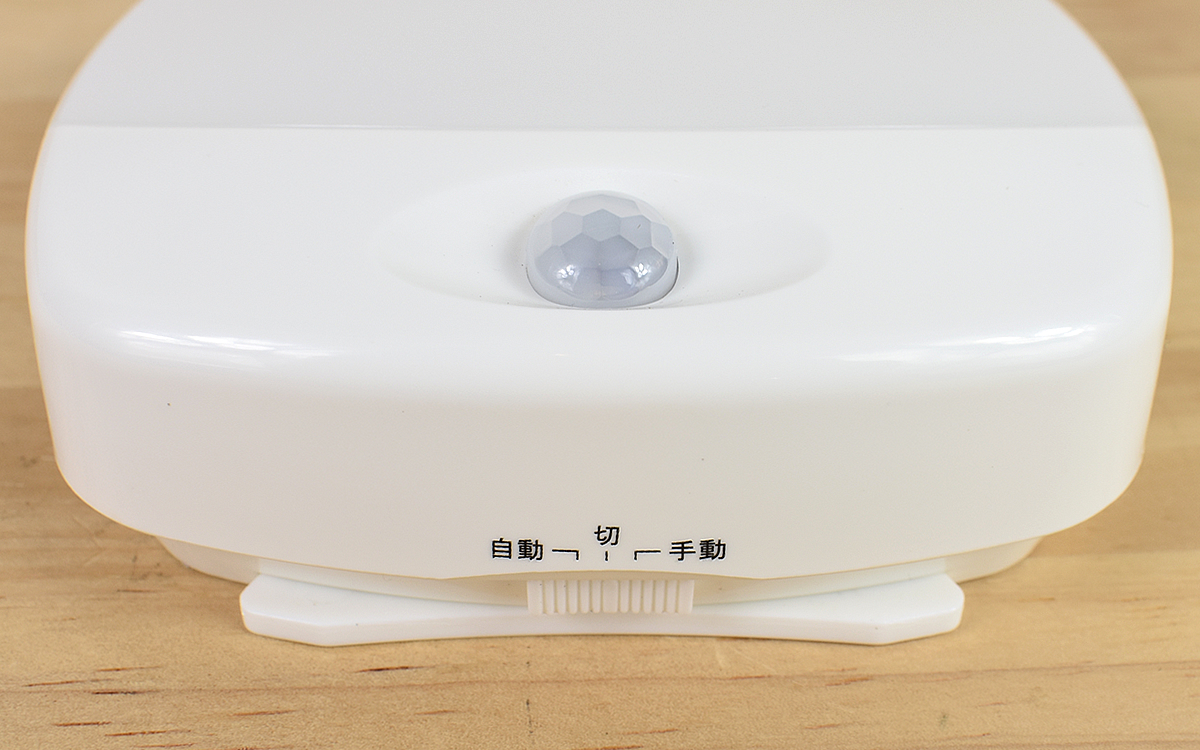実際にセンサーライトを使用してみて、最初に「これは便利」と感じたのは本体下部のスイッチで自動・手動が簡単に切り替えられるところ。自動モードは周囲が暗くて人の動きを感知した時に点灯し、手動モードの場合は常にライトを点灯させておくことができます。