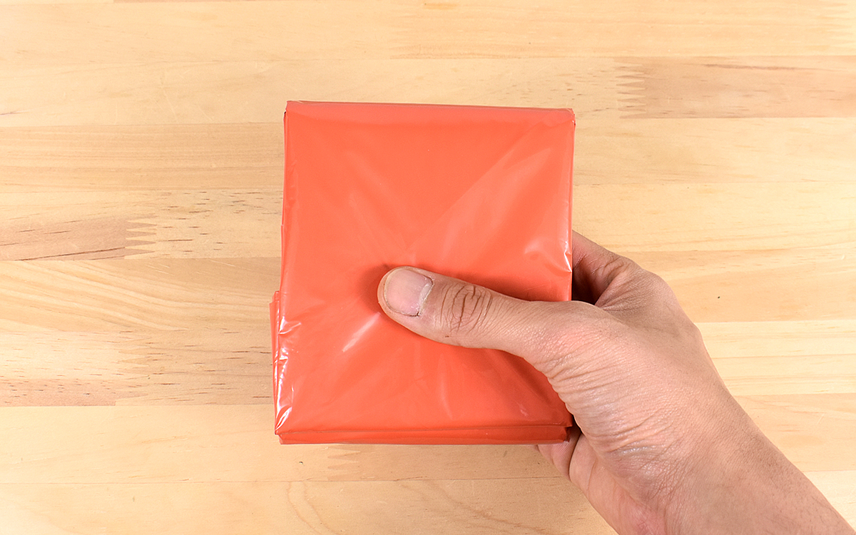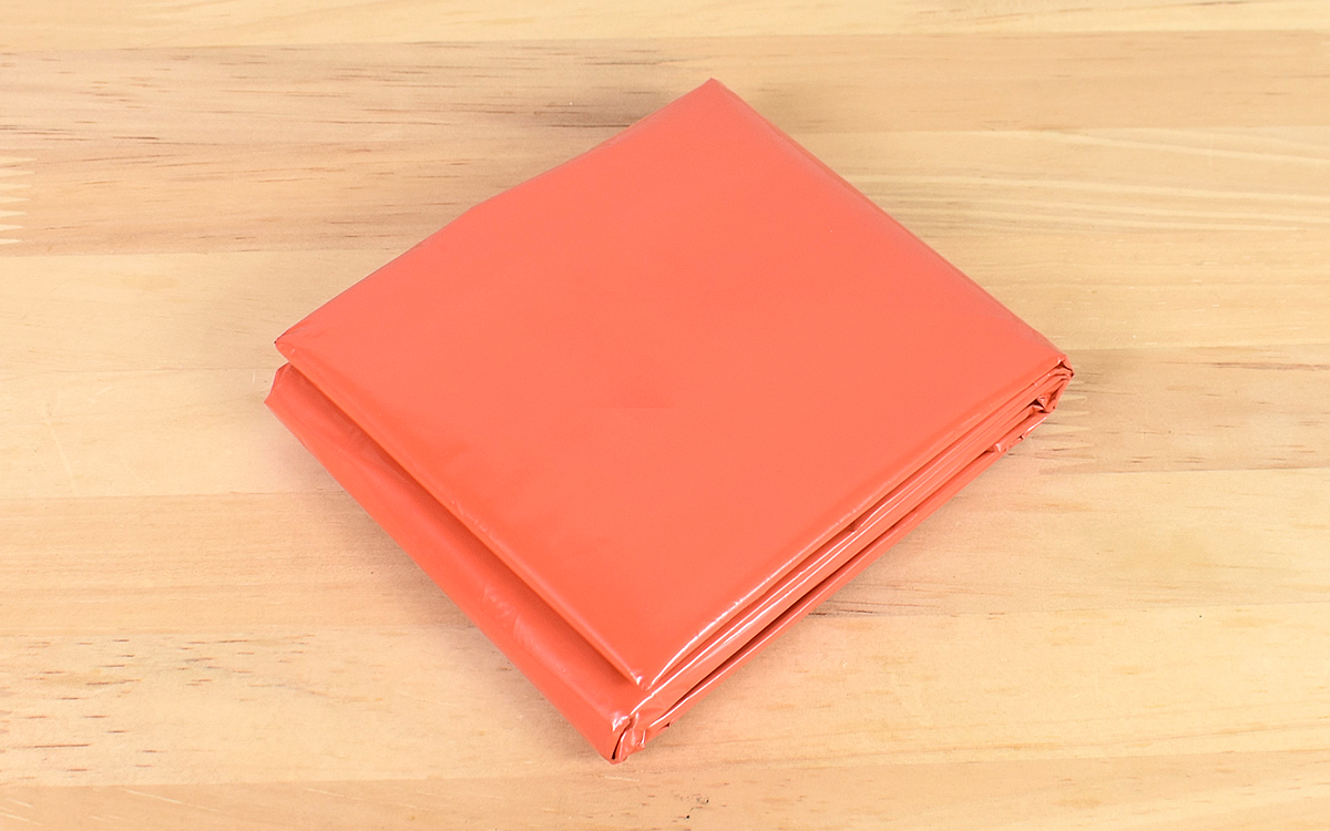 手元に届いたパッケージを手にして、コンパクトに折りたたまれたサイズ感にびっくり。使用時の寸法は900×2100mmとありますが、まさかここまで小さくまとめられるとは…。厚さがわずか約0.026mmしかない、アルミ蒸着PE素材ならではの特性です。
