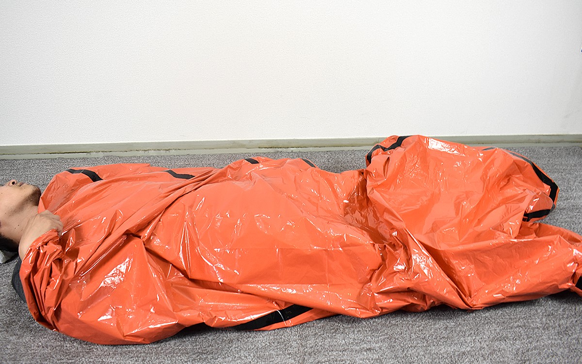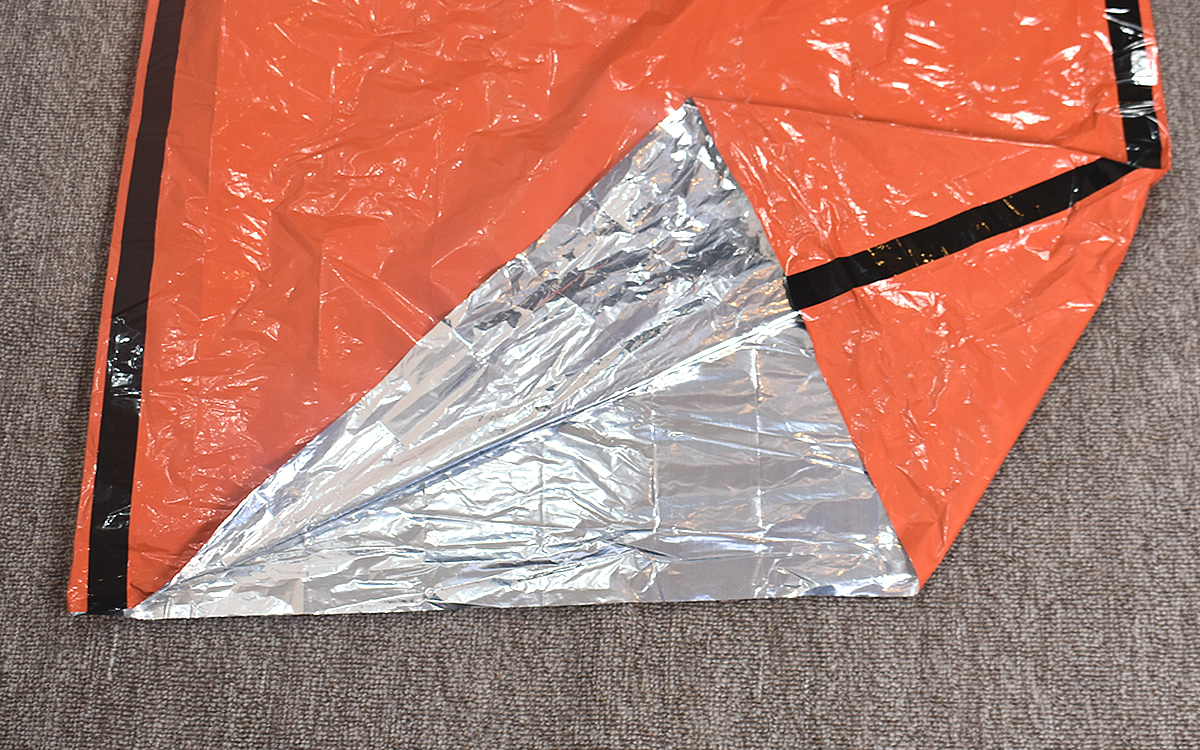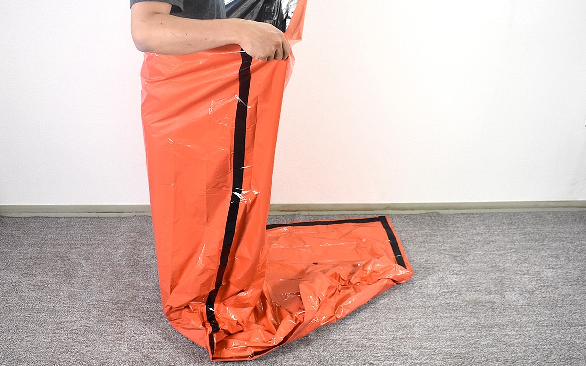 さっそく開封して広げてみたところ、商品名のとおり長さに余裕のある寝袋状になりました。その際に気づいたのですが、アルミシートを触った時に発生する耳ざわりな音があまりせず。これなら避難所などで使用しても周囲に迷惑をかけることがなく、自身もストレスなく寝られるはずです。