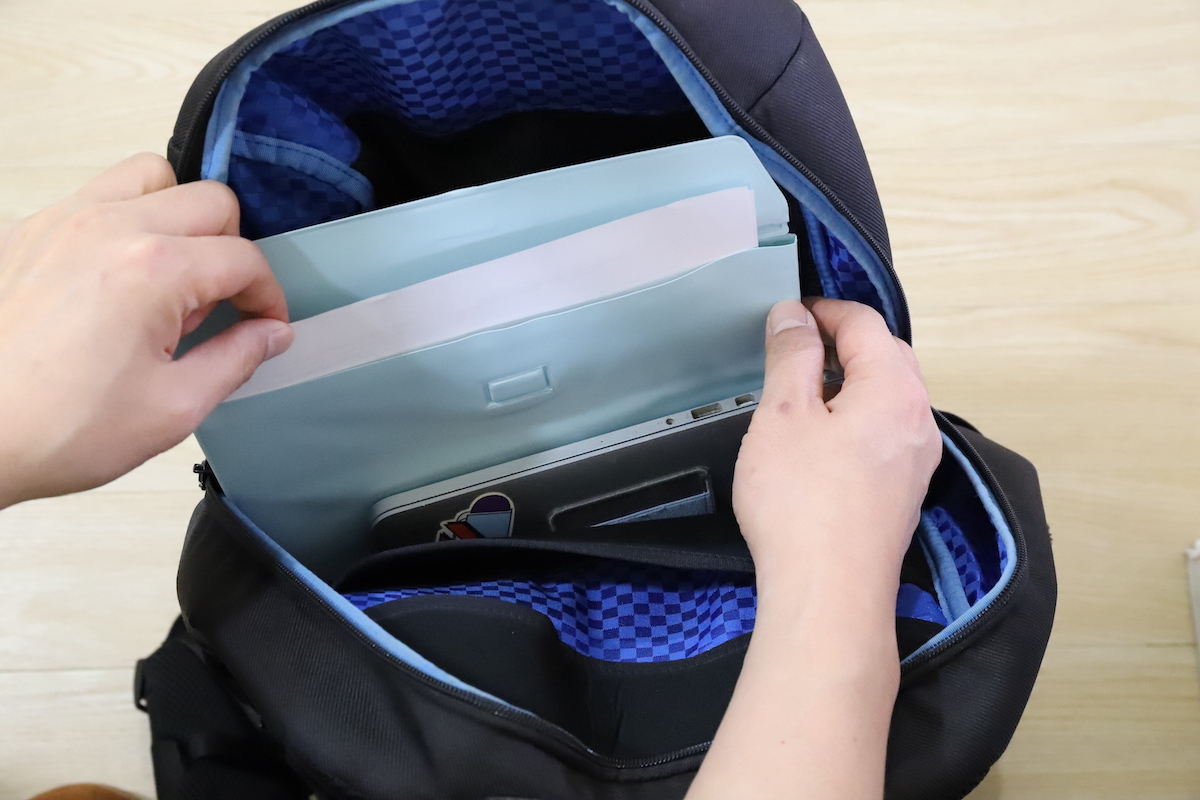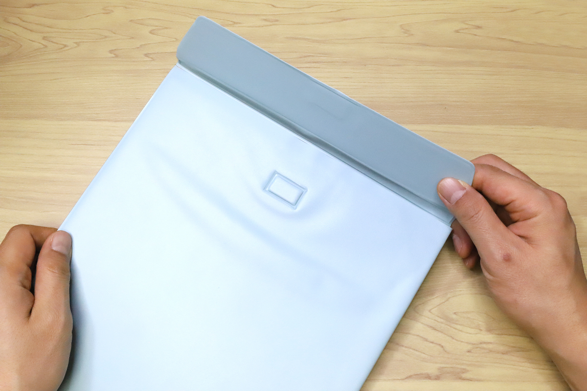 また、今回使用しているブルーをはじめ、グリーンやホワイトなど明るめの色が揃っているのも大事なポイント。このカラーに加えて程よい厚みもあるため、ペラペラかつ透明のクリアホルダーより、カバンの中で目につきやすいのだ。