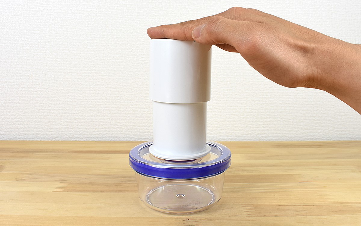容器を手にして気になったのは、フタの中央に備えつけられたドーム状のゴム。ポンプを使う時に外す必要はなく、そのままフタ中央のくぼみにポンプの底を重ねます。説明書きに従い、そのまま複数回ポンプが重くなるまでプッシュしてみたところ…。