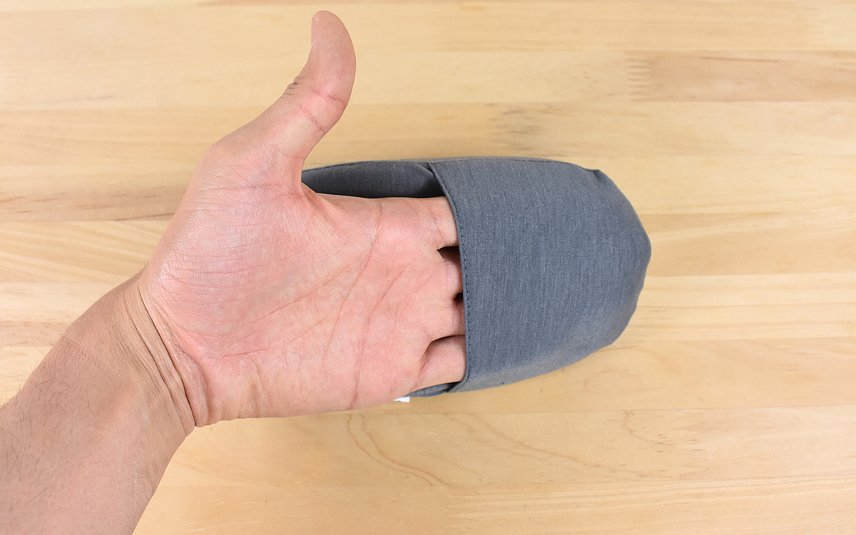 枕の片面にはポケットがついており、中に手をはめて使用可能。実際に「ちょっと寝枕」を挟んでうつ伏せになったところ、おでこのちょうど良い位置に枕が当たってくれました。