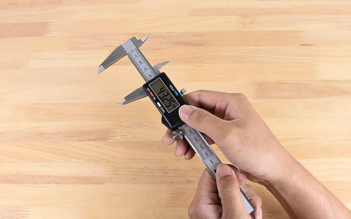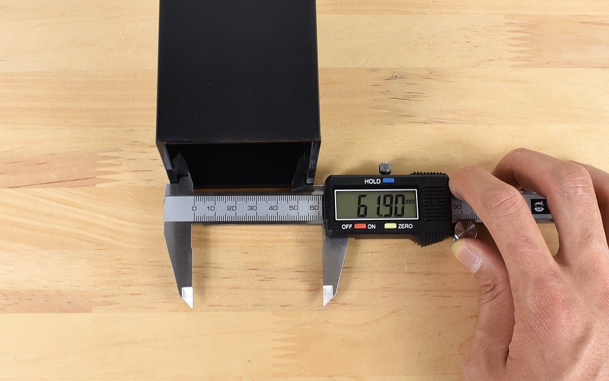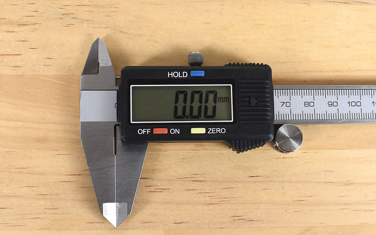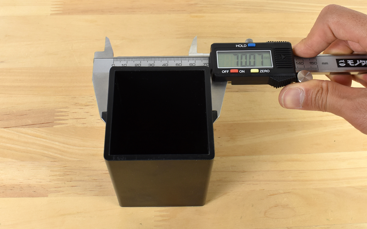 普段使わない人にはあまり知られていないのですが、ノギスにはいくつかの測定方法が。まずは最も一般的な「外側を測る」やり方です。液晶の下についている一番大きな測定面で、対称物の外側を測ってみました。