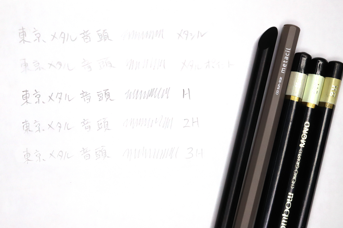 また、黒鉛配合による効果としてもうひとつ、消しゴムで筆跡が消せる、というのもある。メタルポイントペンの筆跡は、一度紙に定着すると非常に消しにくいものだが、「メタシル」は普通の鉛筆に近く、こすって消せるようになっている。