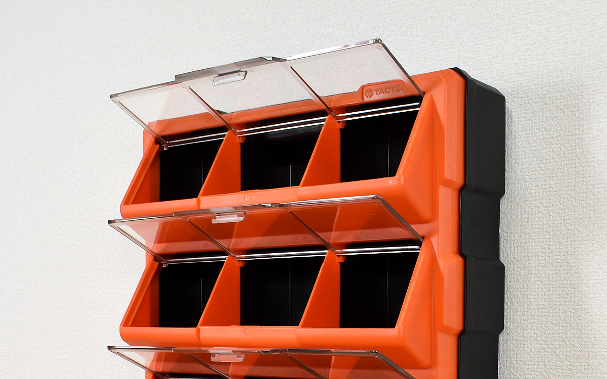 キャビネットのフタが透明なので、中に何が入っているのか一目でわかりやすいのも便利。フタを開けたままの状態でもキープできるので、ものを取り出す際もストレスフリーです。作りがしっかりしているためか開ける際は少し力が必要でしたが、その分カンタンにフタが開いてしまうこともありません。ばらつきやすい小さな工具や釘などの素材を収納するのにも向いていると思います。