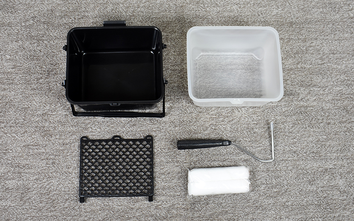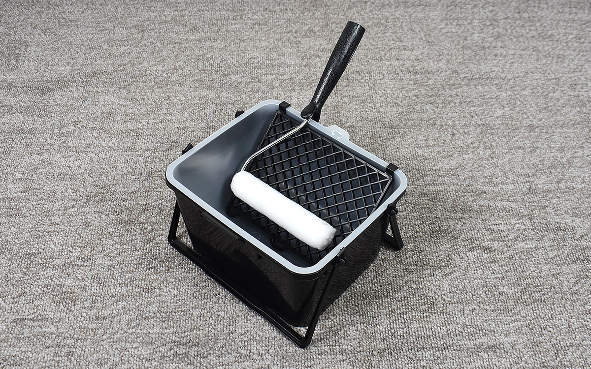 ローラーのサイズは約150(幅)×27mm(外径)。対するバケットは243(幅)×140(高さ)×205mm(奥行)と開口部が広く、余裕をもってローラーを入れることができます。バケットに装着したことで傾斜がついたしごきネットも、塗料の量の調整にちょうどいい角度。これですぐにでも塗装をおこなえるようになりました。