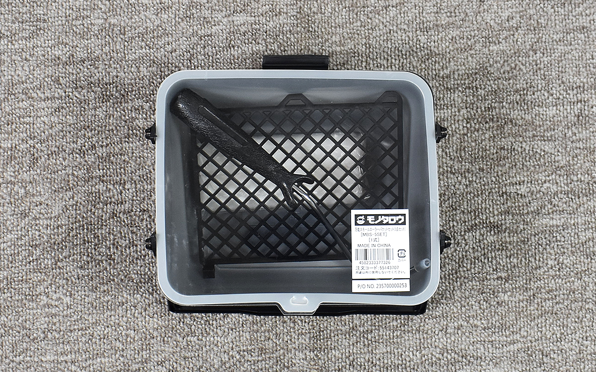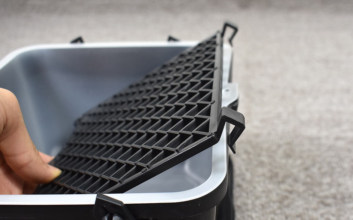 それでは、さっそく5点のアイテムをセッティングしてみましょう。まずはバケットに内容器を収め、続けてローラーに含ませる塗料の調整に使用するしごきネットを装着します。縁についたツメでしっかり固定できるので、ちょっとやそっとの力でズレてしまうことはありません。