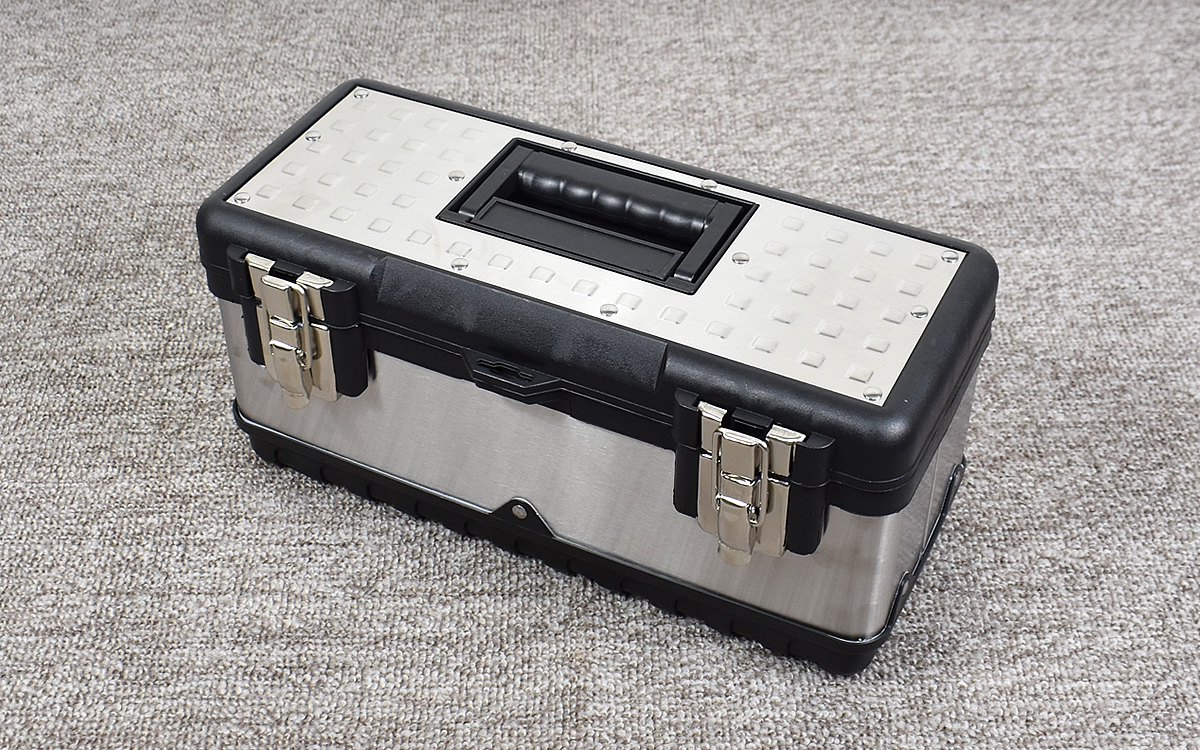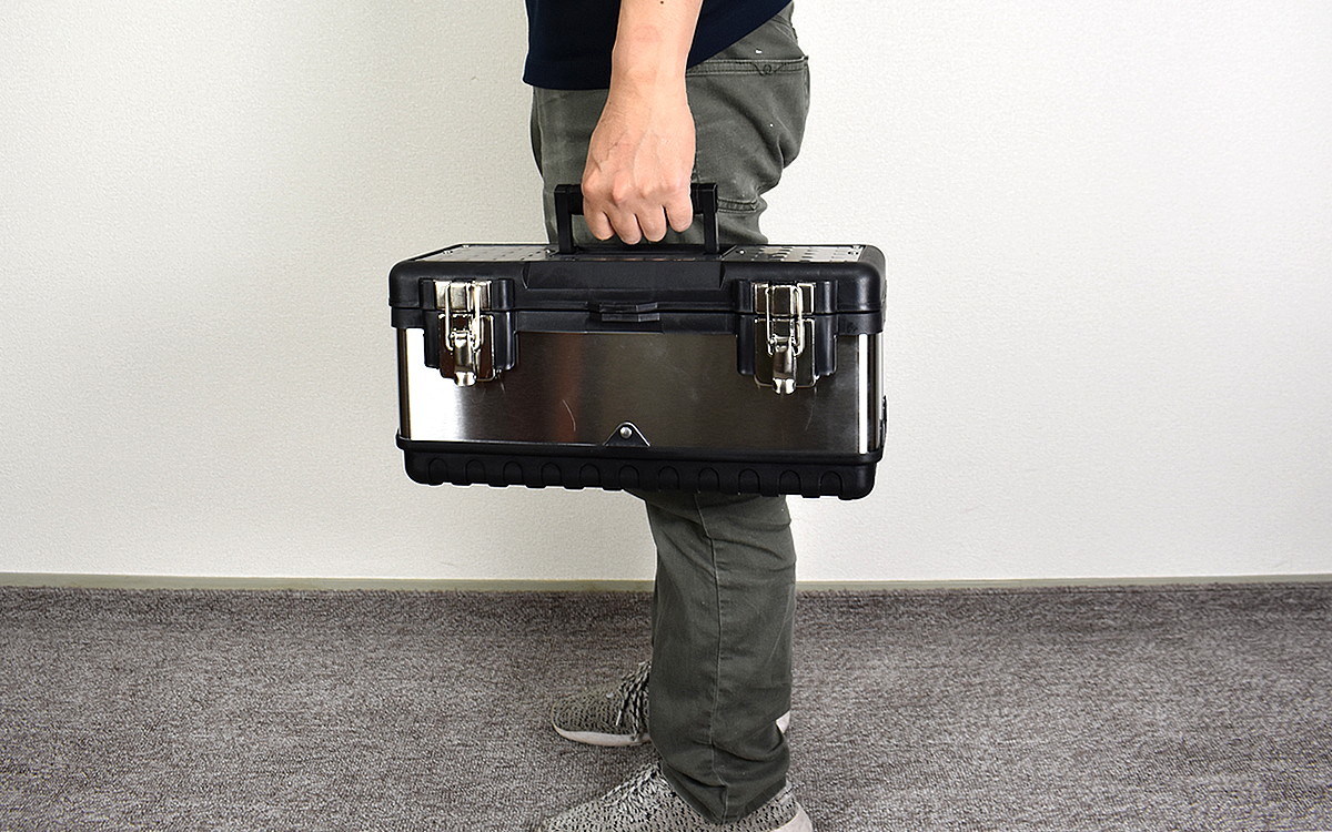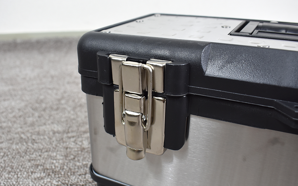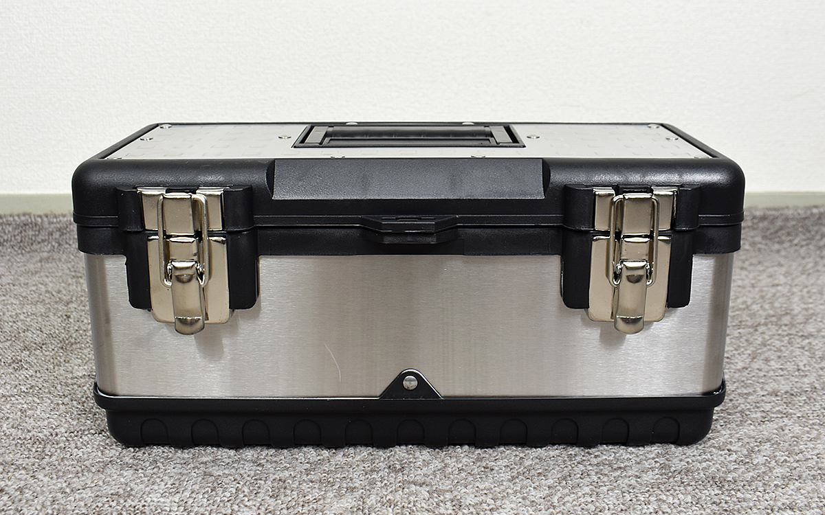 本製品は派手すぎないステンレスのシルバーと樹脂部分の黒とのバランスがかっこよく、渋い工具箱という雰囲気を醸し出しています。ボックスの外寸法は約380(間口)×160(奥行)×180mm(高さ ※バックル部除く)で、重量は約1.54kg。ステンレス製だけあって決して軽くはありませんが、見た目ほど重くは感じません。