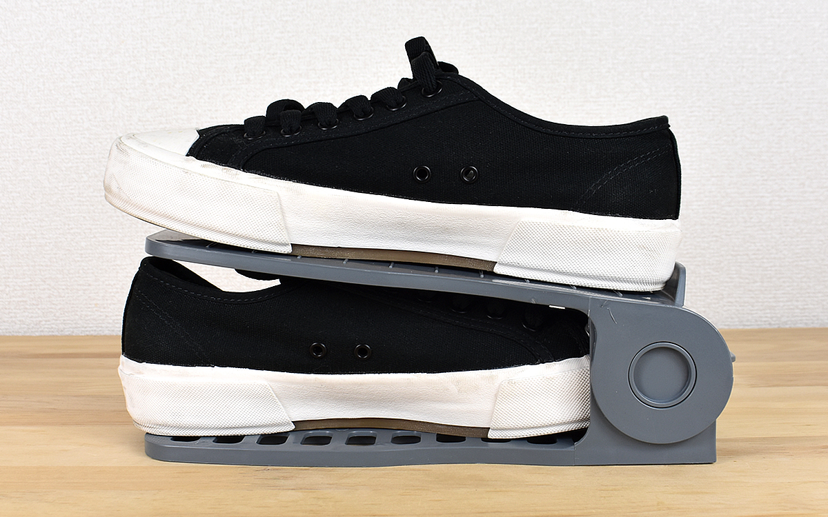 玄関や靴箱の限られたスペースを有効活用するためには、左右の靴を縦に並べられる「シューズラック」が役立ちます。しかし使える靴の種類に制限があったりと、「これぞ!」という商品を見つけられずにいました。そんな中で見つけたのが、ダイソーの「角度が調整できるシューズラック」(110円/税込)。画期的な角度調整機能に注目しつつ、早速使ってみましょう。