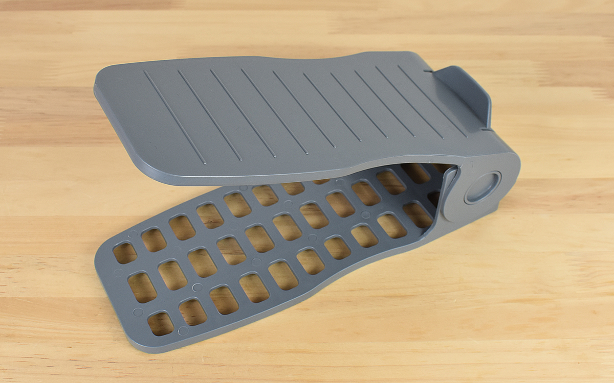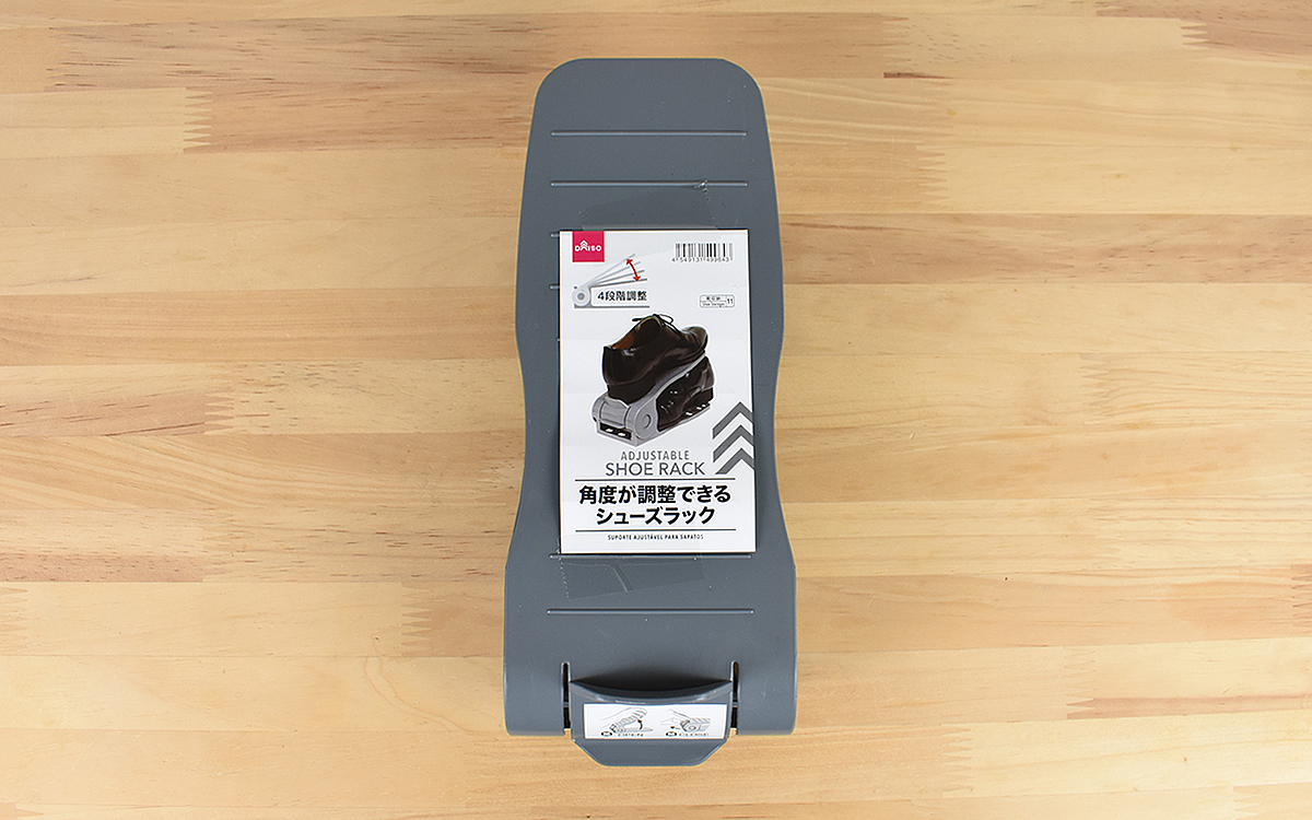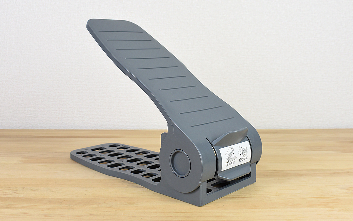 ちなみに、角度を広げると上の段がかなり斜めになってしまうので注意が必要。しかし上段には滑り止めの凹凸が刻まれているため、通常使用の範囲なら靴が落ちてくることはなさそうです。軽く揺らしてみましたが、安定感は問題なし。大切な靴も安心して乗せておけます。