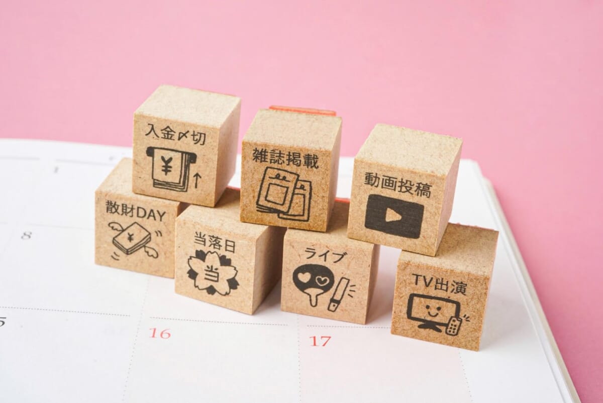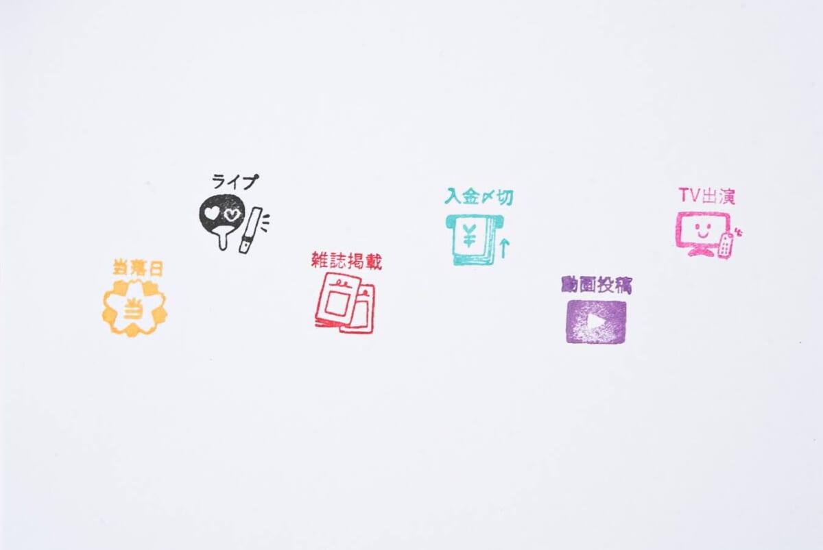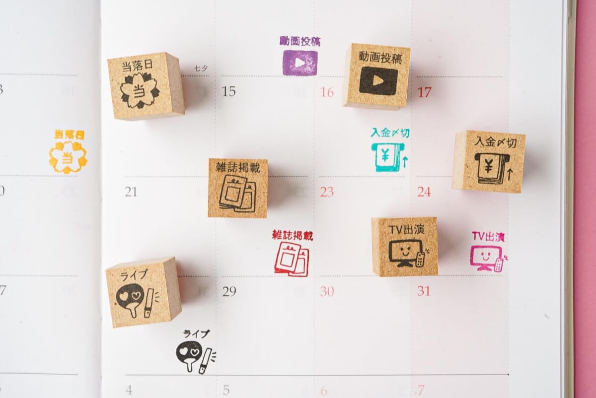 私は仕事柄、自分のメディア出演をSNSで告知する必要があるのですが、撮影が終わるとほっとして気が抜けてしまい、公開日を告知しないまま出演番組の放送が終わってしまうことがあります。告知までしっかりしなければと思いつつ、そこでどうにか楽しくスケジュール管理したいと思って購入したのが「雑誌掲載」「TV出演」「動画投稿」でした。(その他の印面は、今回の連載で皆さんに紹介するためにスタンプマルシェさんからお借りしました。)