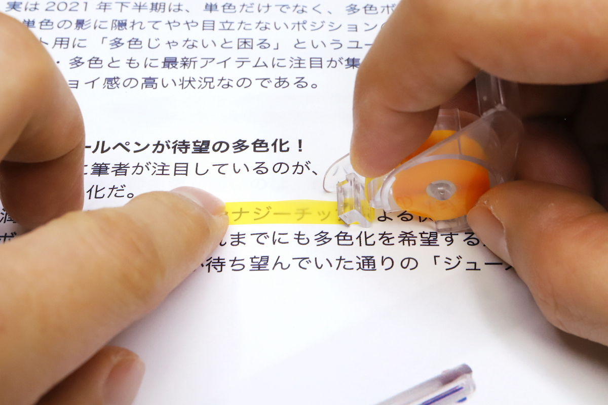 ラインマーカーは何色かを使い分けることが多いツールだが、これならペンケースに複数色をストックしていても、以前ほどかさばりを感じることはないだろう。