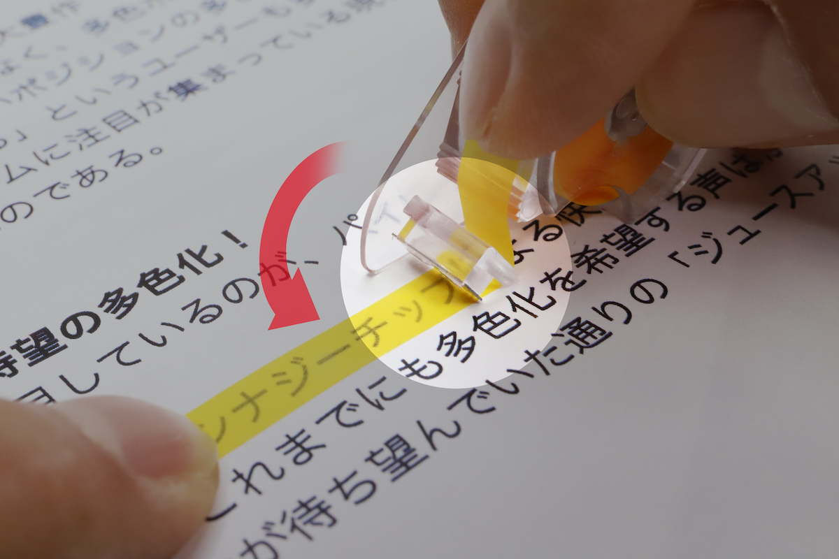 マーキングしたい文末までラインが引けたら、テープカットだ。テープ出口付近を人差し指でふさぐようにして押さえたら、本体を軽く前転するように傾けてちょっと引く。すると、プツッと軽い手応えで内部の刃がテープを切ってくれる。