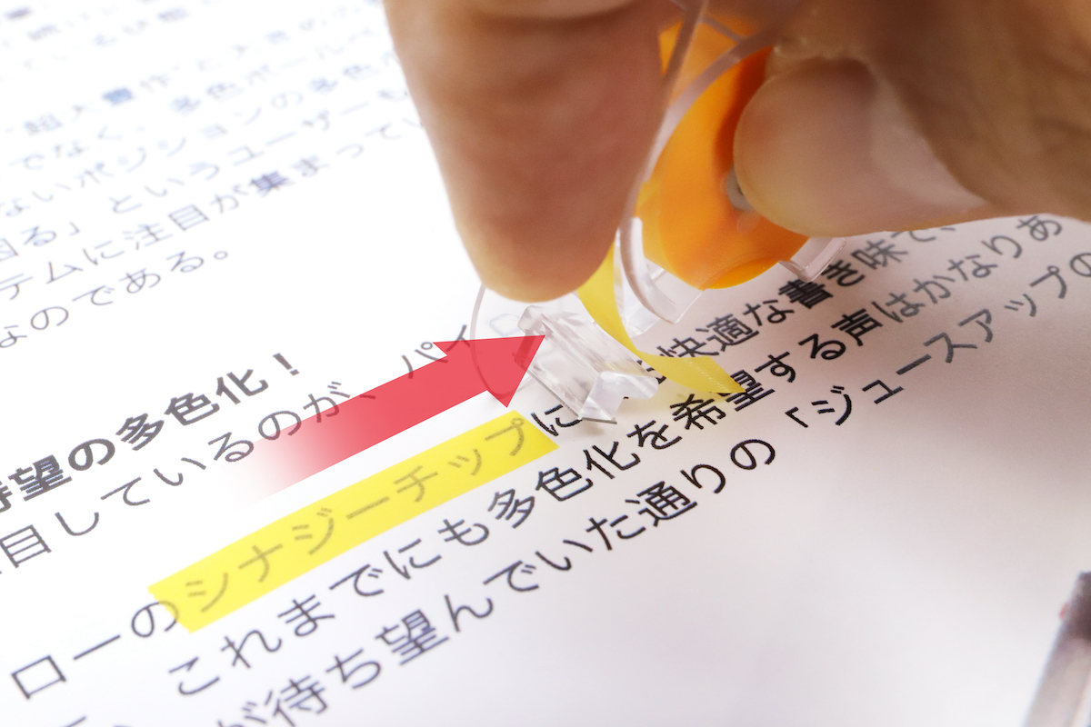 しかし、総じて不満のないパーフェクトなマーカーになったか? と問われると……正直なところ、まだ使い勝手で微妙なところは残っていると感じた。なにより、ラインを引くのに必ず両手での作業が必要になるため、軽快さに欠けるのは間違いない。やはり修正テープのように片手で引けるようにならないと、根本的な解決にはならなそうだ。