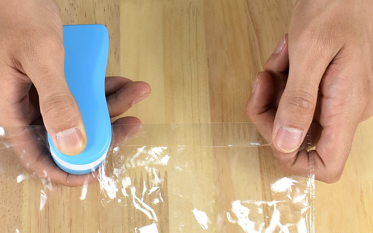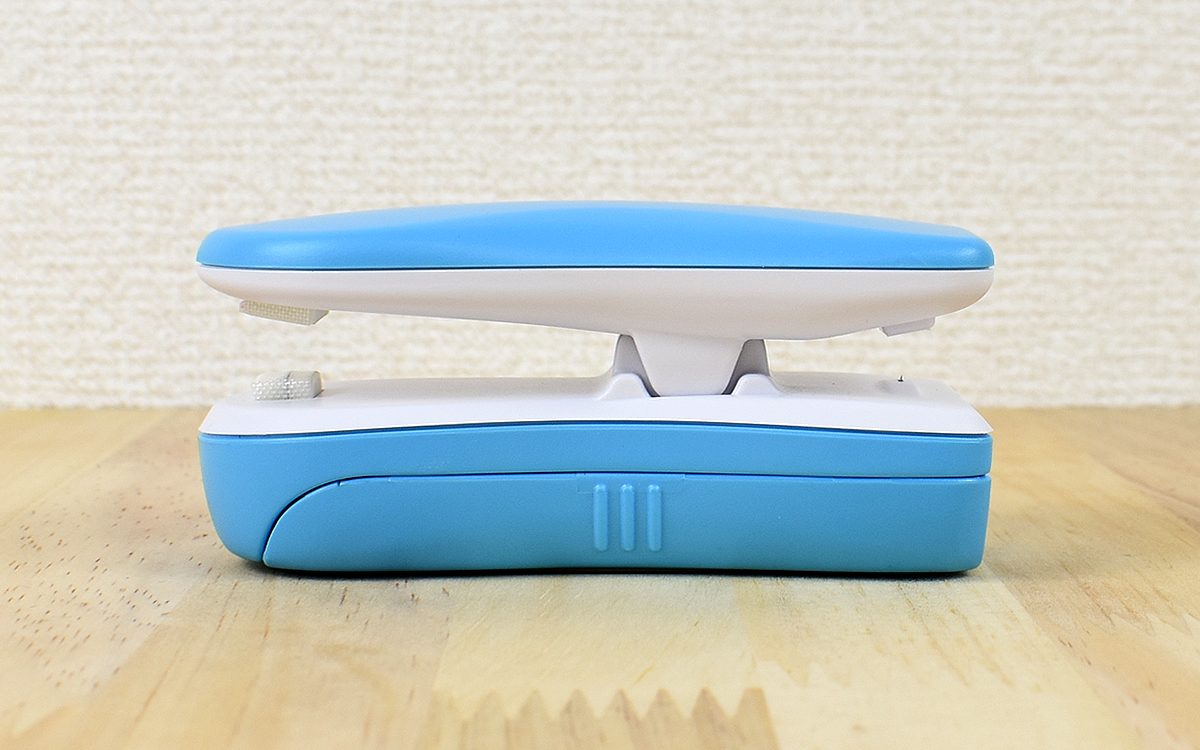 それでは単3アルカリ乾電池2本をセットして、実際にシーラーを使ってみます。使い方はシーラーで袋の端(約2~3cm)を挟んだら3秒ほど押し続け、そのまま逆端に向かってスライドするだけ。あとは袋を反転させて密封部分を横切るようにシーラーを動かせば、あっという間に袋を閉じられました。