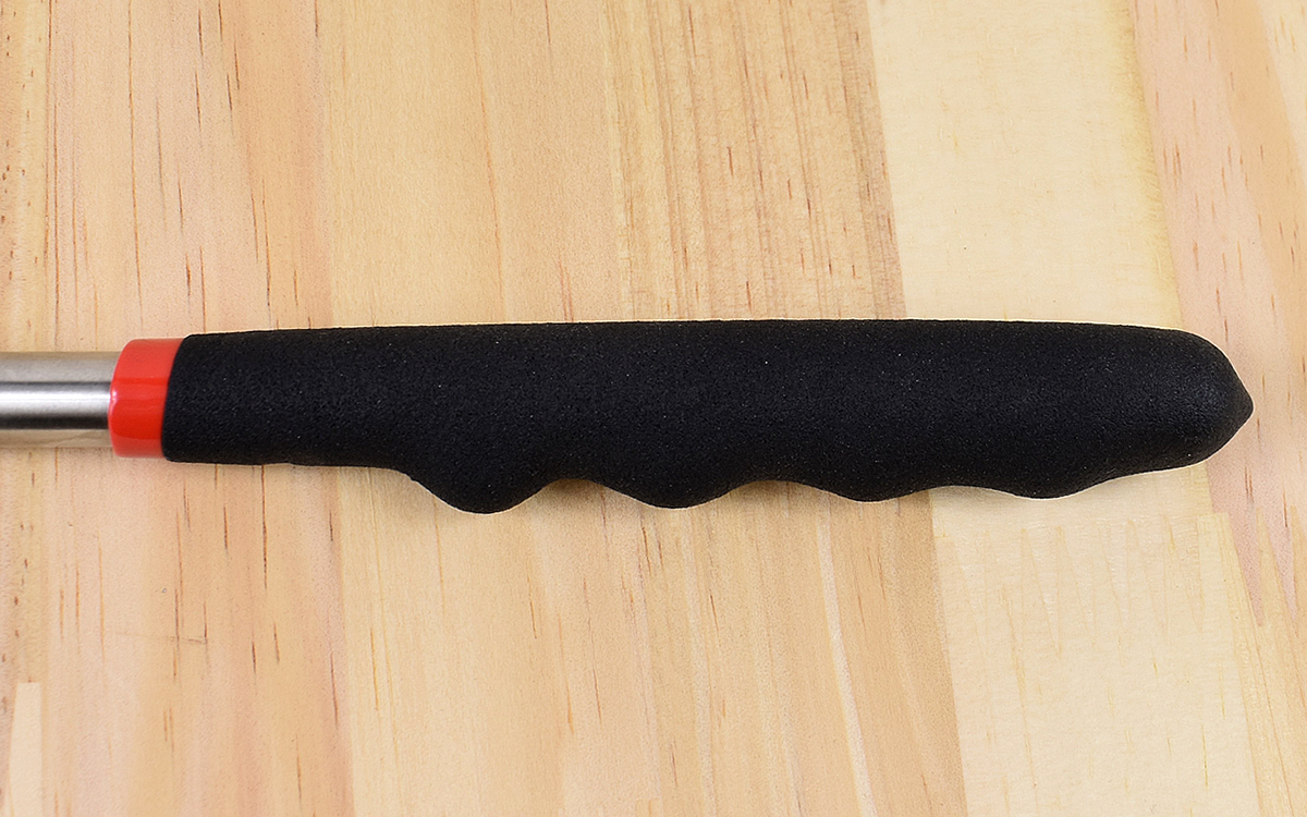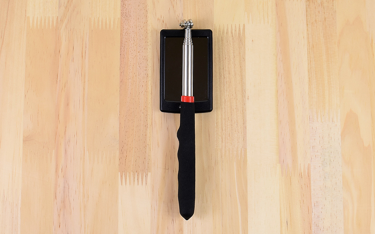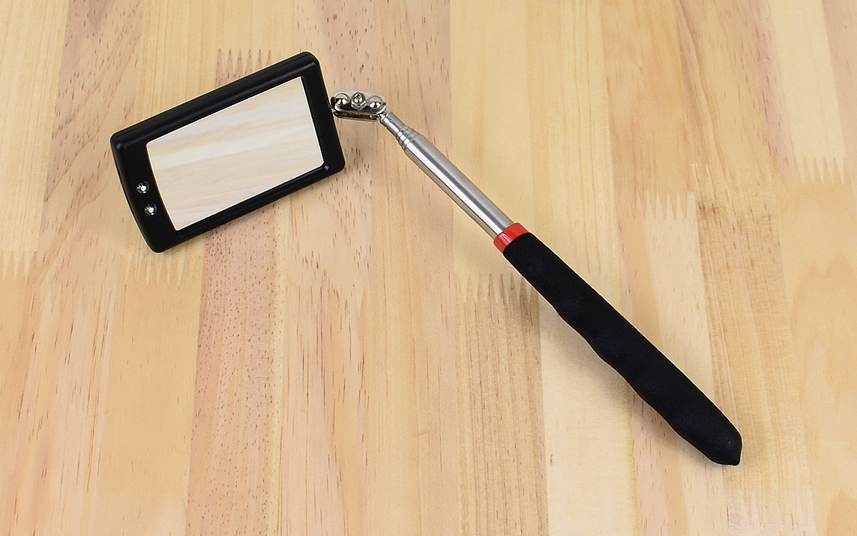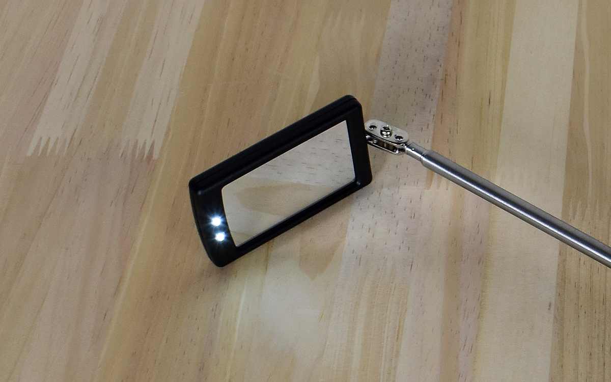 同製品はステンレス製のアンテナの先にプラスチックフレームがついており、点検鏡とLEDライトが取り付けられた形状。見えそうで見えない場所をどうにかしたい… という煩わしさを解消してくれます。グリップ部分は波打った形ですべりづらく、手にしっかりとフィットしました。