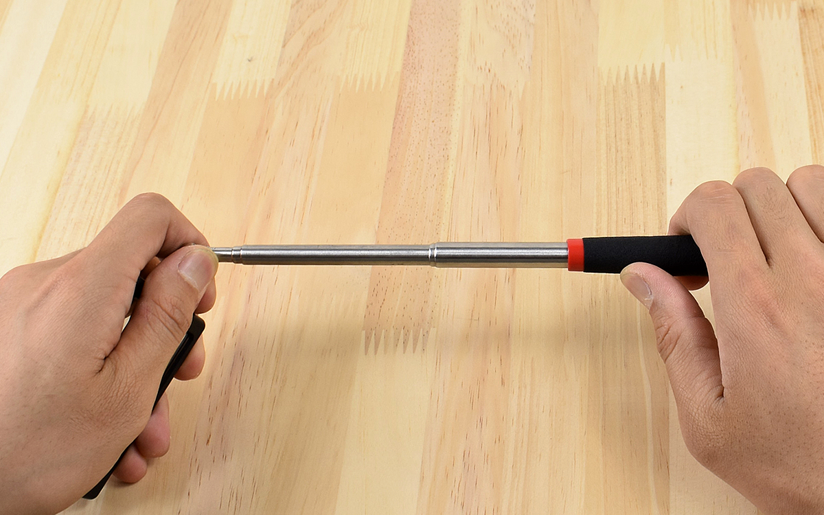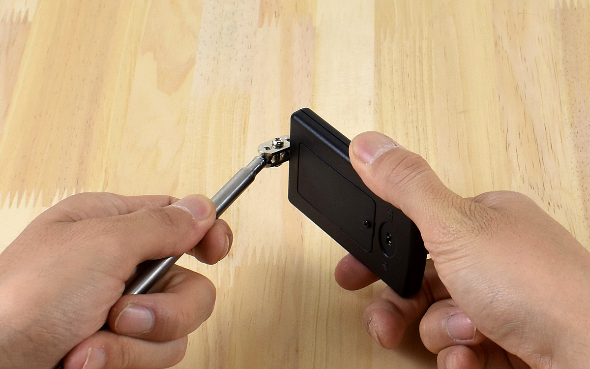 次にアンテナを伸ばしてみましょう。アンテナは全長880mmまで伸ばすことができますが、アンテナを伸ばしきると重心が点検鏡の方へ寄るので注意が必要。細かい場所を点検するには繊細なコントロールが必要です。