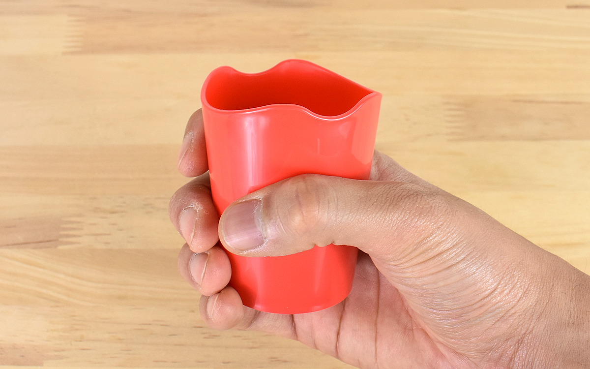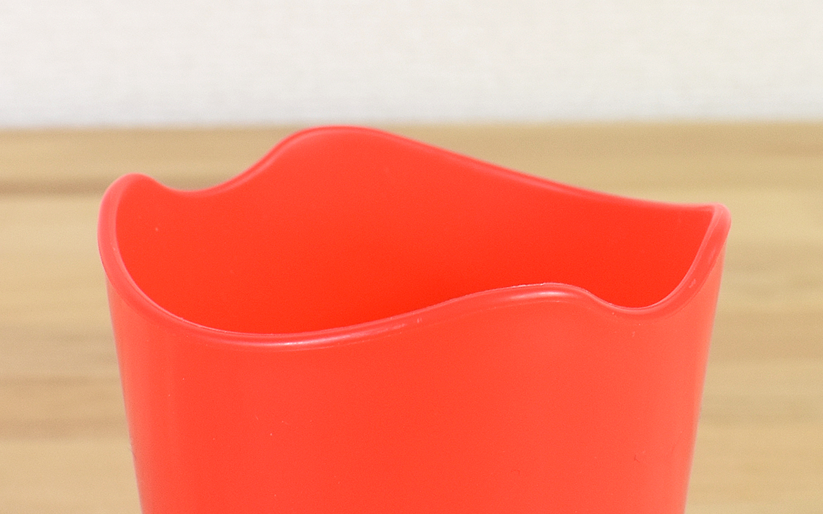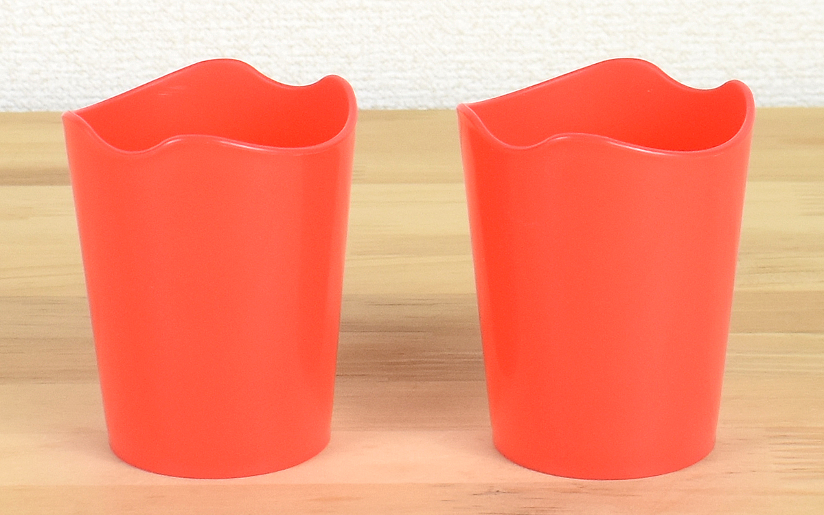“Wave(波)”の名前が示すとおり、波打った飲み口が特徴的な同商品。2個でワンセットになっていて、大きさは6.5(幅)×6.5(奥行)×8cm(高さ)と大人の手にちょうど収まるほどのサイズ感です。ポリプロピレンでできているため、質感はツルっとなめらかで軽い印象。コンパクトなので、小さな子どもも持ちやすくなっています。