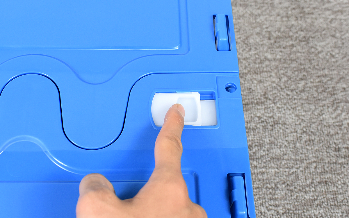 それではぺたんこにしたコンテナを組み立ててみましょう。組み立てるときは、フタについているロック(白いパーツ)2つをスライドして外し、フタを開けておきます。