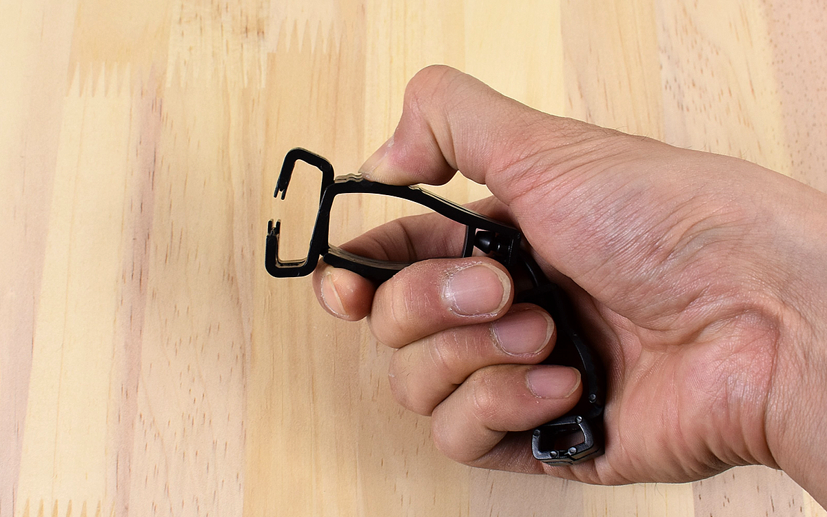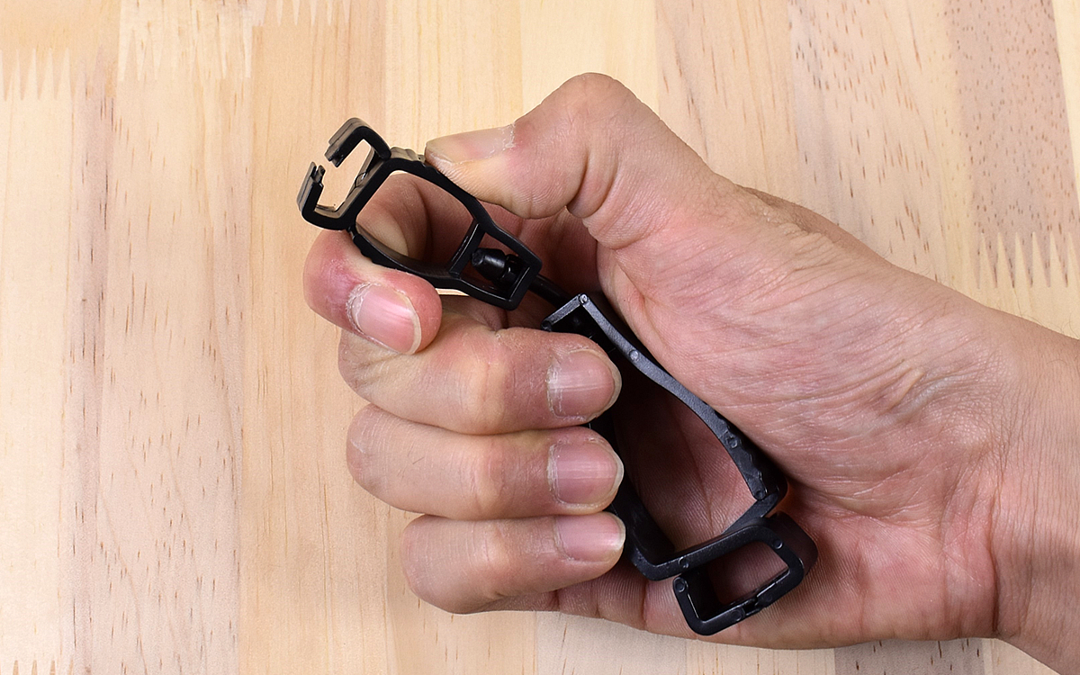 「グローブホルダー」の素材はプラスチックよりも強度があるPOM製。強く握ってもかなりがっしりしており、ぶつけたりしても耐えてくれそうな頑丈さを感じます。