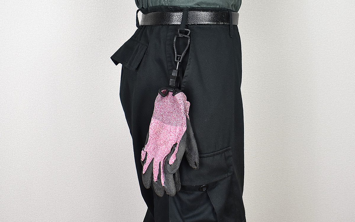作業用手袋をポケットに入れたはずなのに、取り出したら片方がなくなることは日常茶飯事。さらに、仕事中にタオルをどこに置いたのか忘れて探し回ることも…。毎度行方不明になってしまう手袋やタオルに困っていたときに見つけたのが、モノタロウの「グローブホルダー」(329円/税込)です。