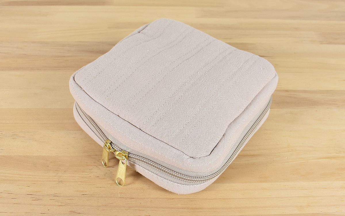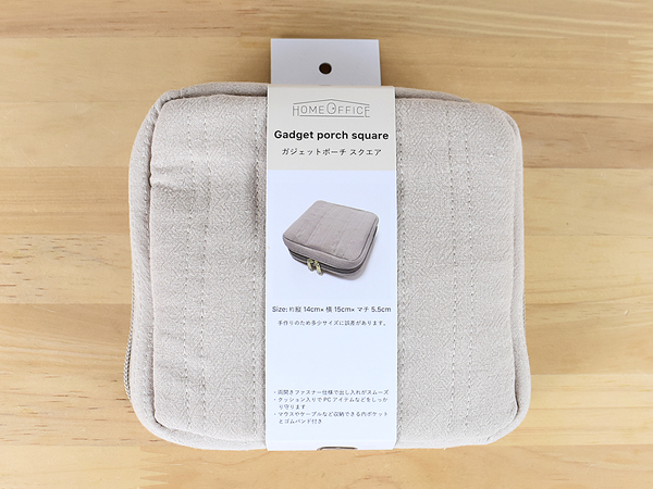 ベージュとカーキの2色展開の同商品。大きさは約14(縦)×15(横)×5.5cm(マチ)で、綿100%の側生地ということもあり柔らかい触り心地に仕上がっています。中材に発泡ポリエチレンを使用しており、多少の衝撃であれば中身に問題はなし。しかし防水仕様ではないので、雨の日に使用する場合は濡らさないよう注意しましょう。