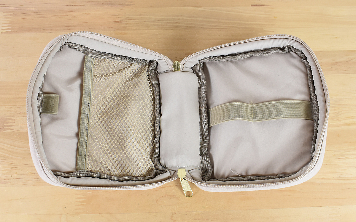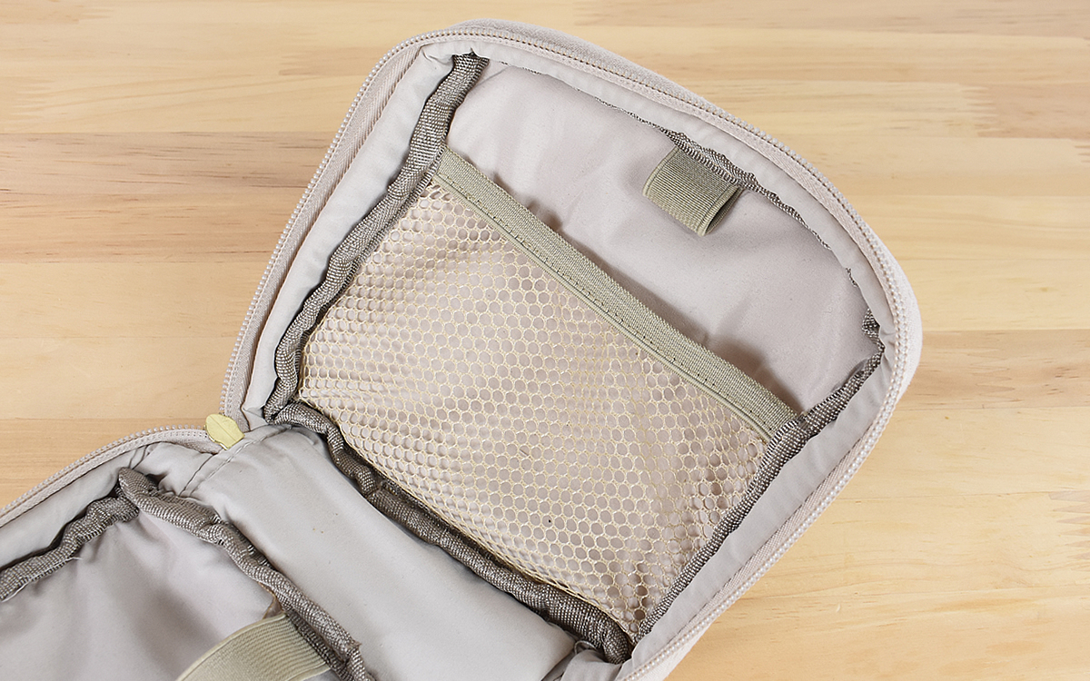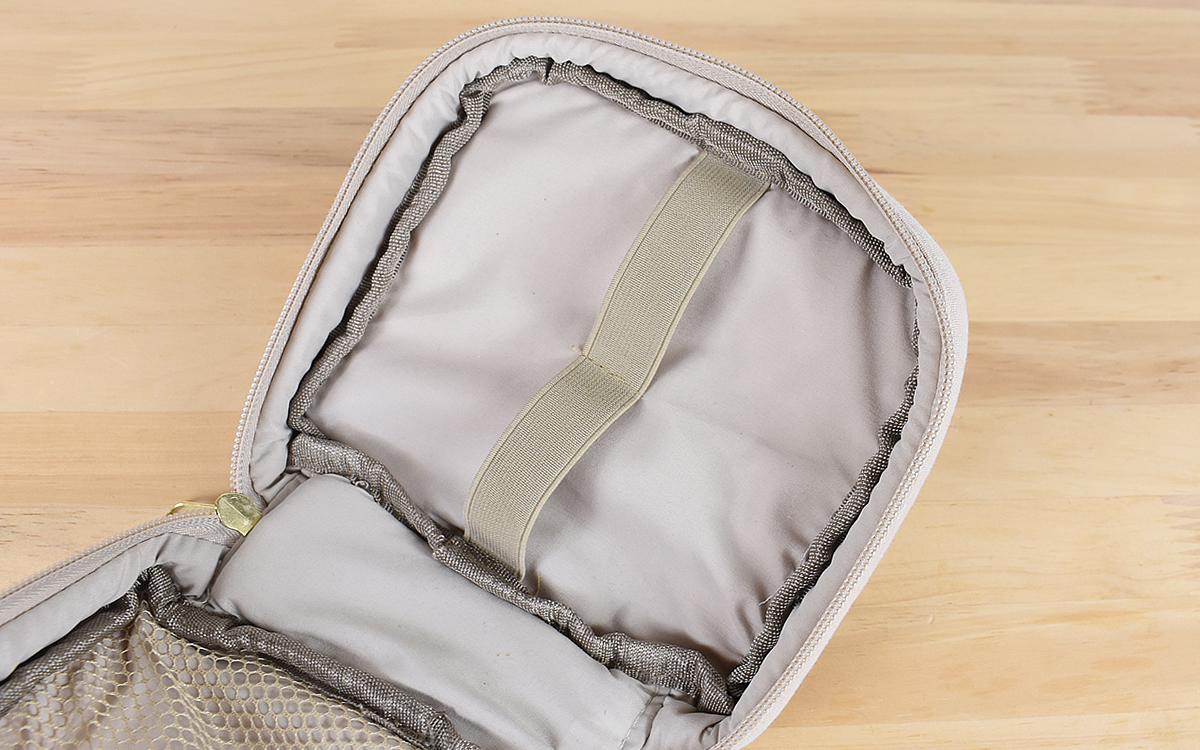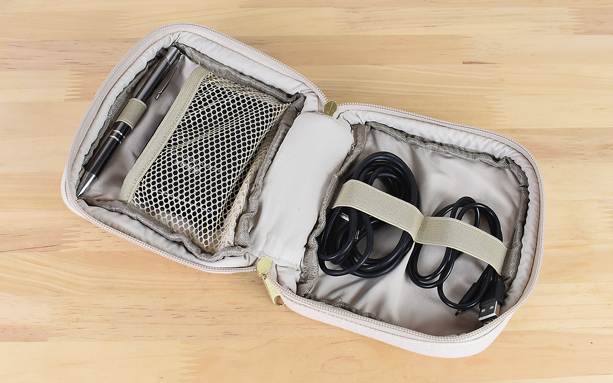 中身を良く見てみると、左右それぞれに別々の収納機能が。ポーチの片面にはケーブル類をコンパクトに収納できるゴムバンド、さらに反対面にはメッシュの内ポケットとペンをしまえるホルダーがついています。