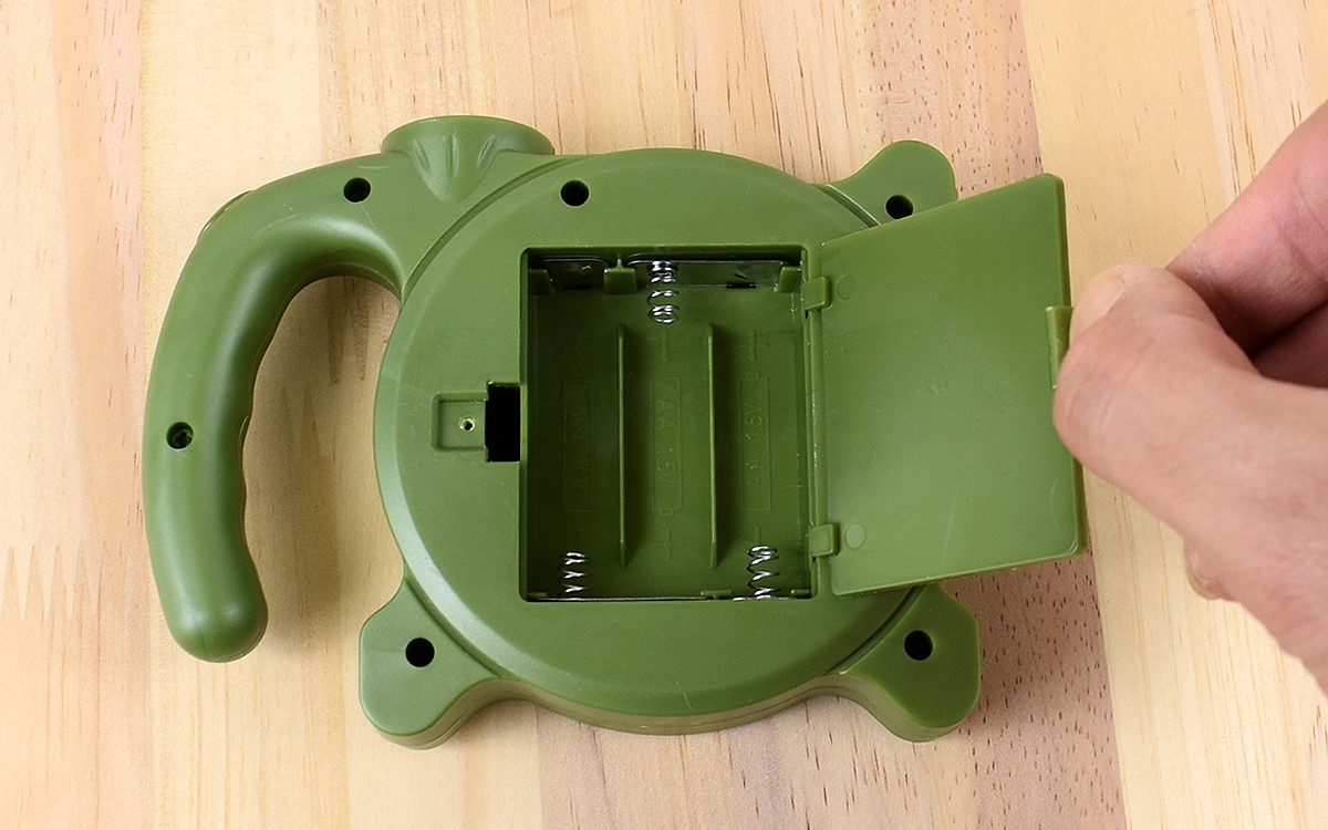「2WAYランタン」の大きさは、およそ10(幅)×3.2(奥行)×13.2cm(高さ)とランタンにしてはコンパクト。単3乾電池3本を使用し、ボタン操作で「ランタン → 懐中電灯 → OFF」と切り替わります。電池の蓋にはネジが付いているので、移動中に蓋が開いてしまう心配もありません。ただ、ネジは小さく電池交換にはプラスのドライバーが必要です。電池交換は室内で行ったほうがよいでしょう。