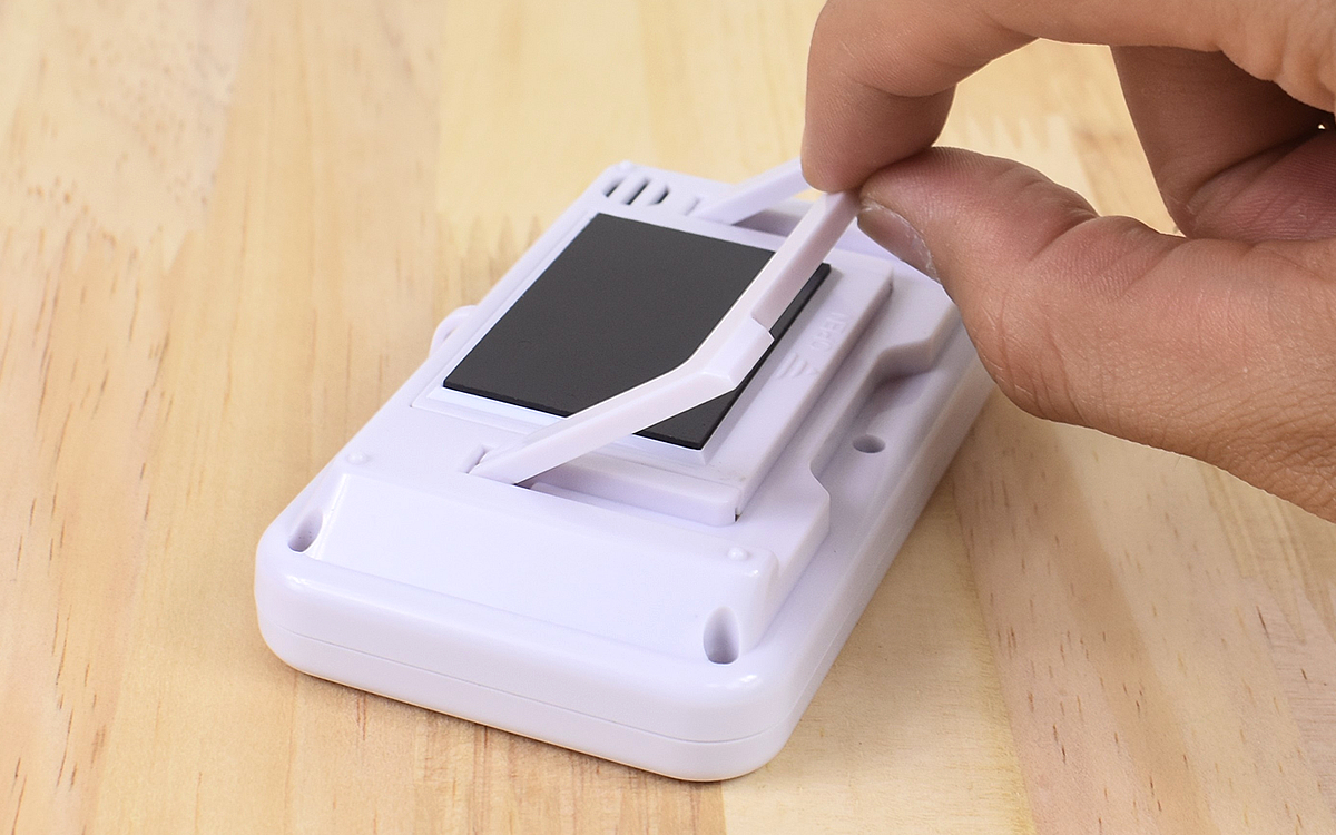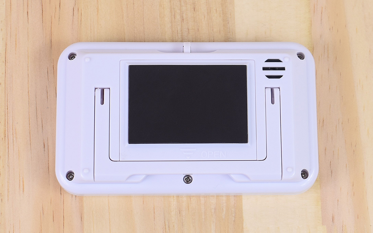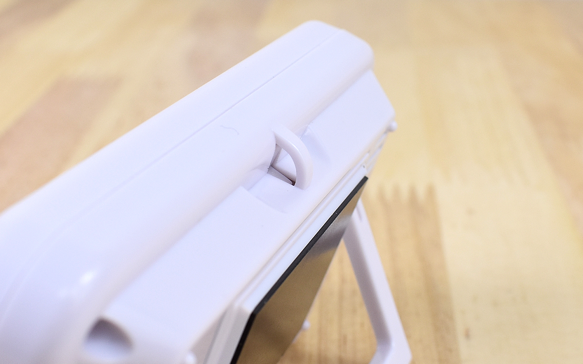背面にはマグネットが付いているので冷蔵庫などにも貼り付けられますが、スタンドを立てて据え置き型にすることもできました。さらに上部に吊り下げ用の穴もあるので、設置方法は全部で3パターン。状況に応じて使い分けられるのは便利ですね。スタンドを起こした状態で、背面の電池ポケットに単4電池を3本入れると使用できるようになります。