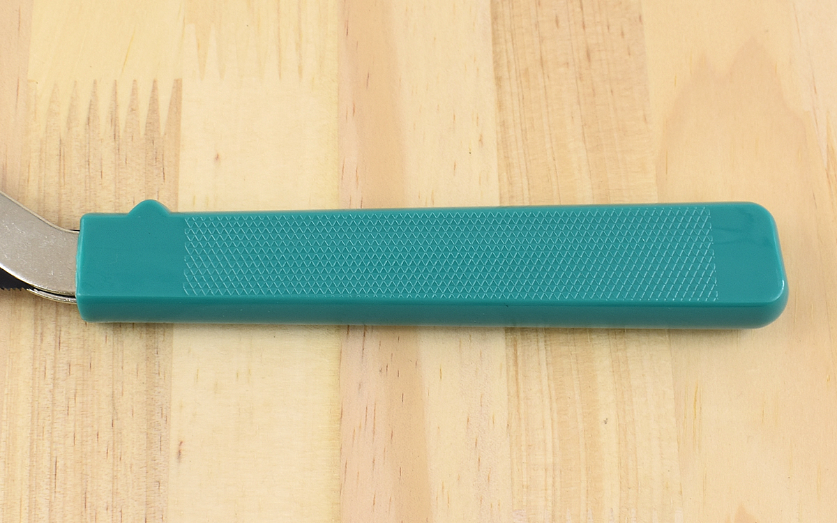 刃の長さは約265mmで、持ち手部分は(支えになる金属部分は含めないで)約130mm。持ち手両面の細かい模様が滑り止めとなり、片手でしっかり力を入れて握ることができます。全体の重さも102gと軽量で使いやすいですよ。