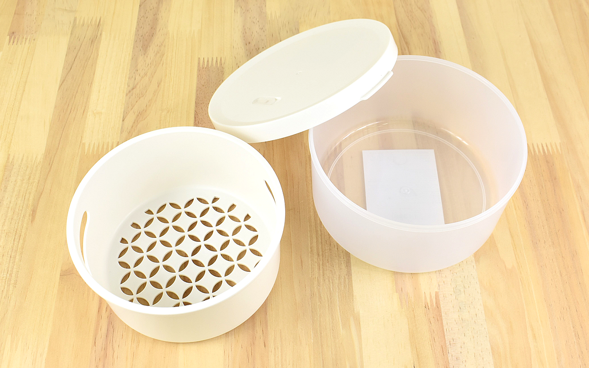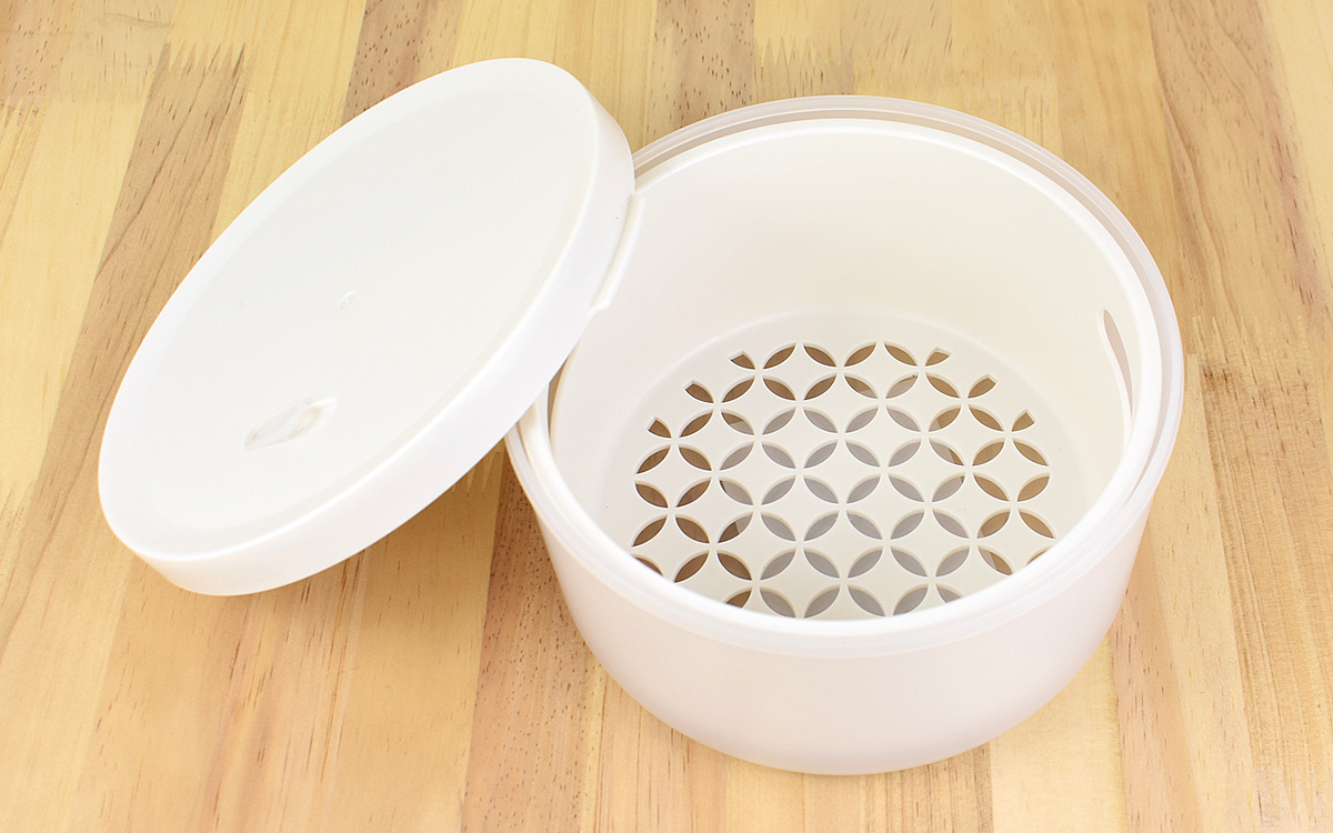 さっそく保存容器を開けてみたところ、見た目が小さいわりに中は広々。サラダ用の野菜などは1~2人分くらいなら余裕で入るサイズ感でした。水切り部分が底面にしかないため一気に水気は切れないものの、保管しながら水切りができるので不便には感じません。また、レンチンした時に出る水気をそのまま切れるのはかなり便利です。