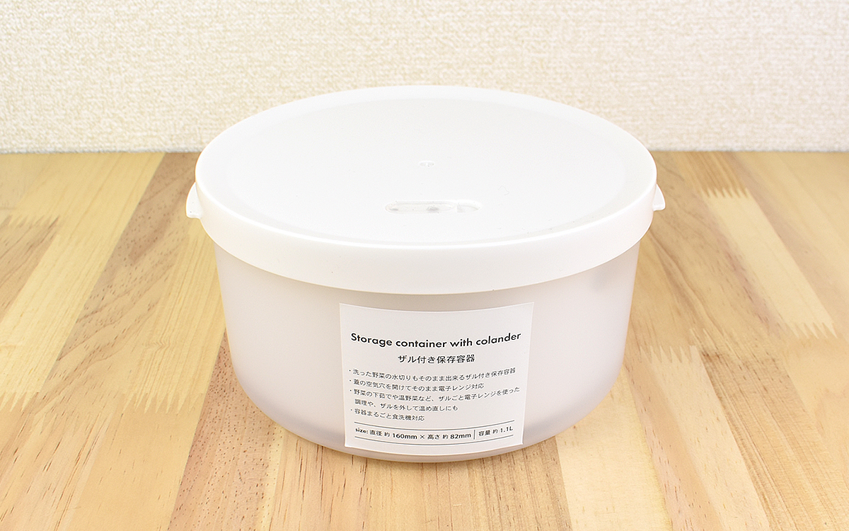 ●1個で水切り&保存どちらにも使える「ザル付き保存容器」(3COINS)