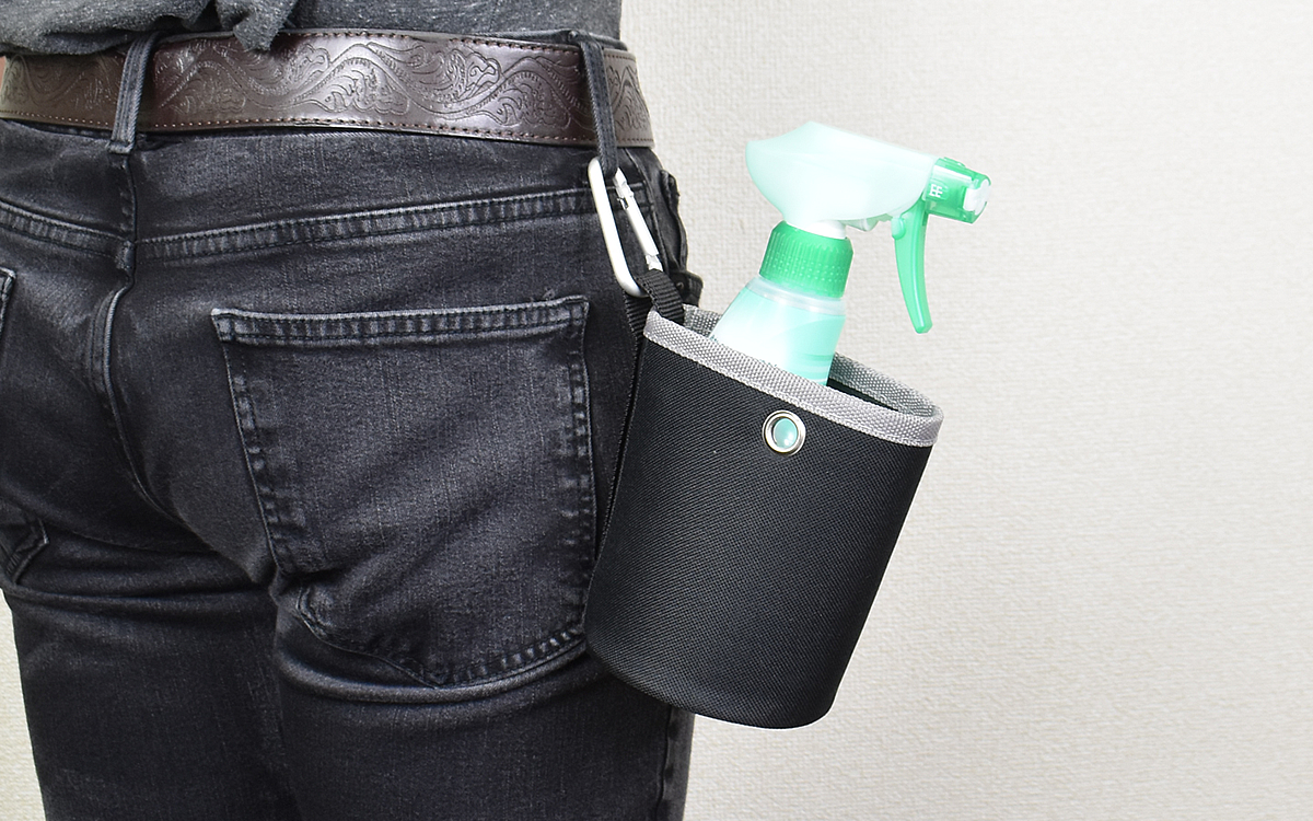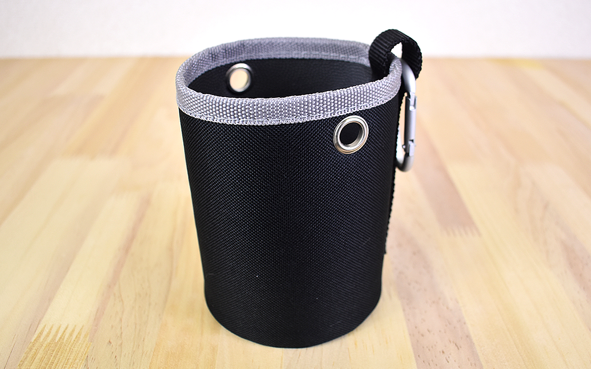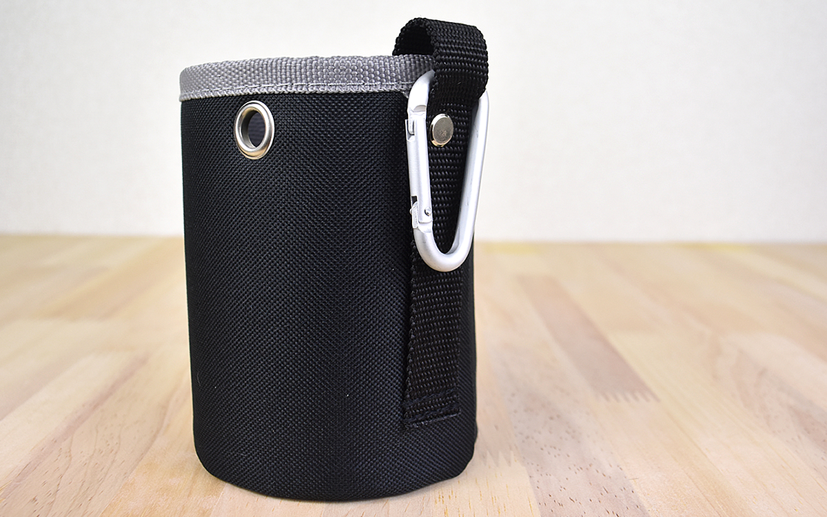 黒を基調にしたデザインがシンプルな同商品。大きさは約95(奥行)×95(幅)×130mm(高さ)と、腰につけても邪魔にならない程のサイズ感です。円筒形の形状で素材もしっかりしているため、腰につけていない時は自立させることも可能。中に仕切りはなく、ポケットなども付いていません。