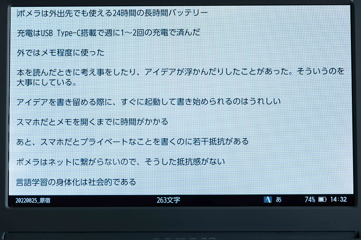 「家での使用は快適でした。特にメモするときは、いままで電子ペーパーで手書きのメモを取ったり、PCでメモを取ったり、あるいは付箋に何か書いたりと、複数のデバイスやアイテムを使っていたのですが、ポメラに一元化できました」