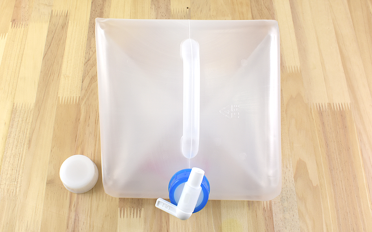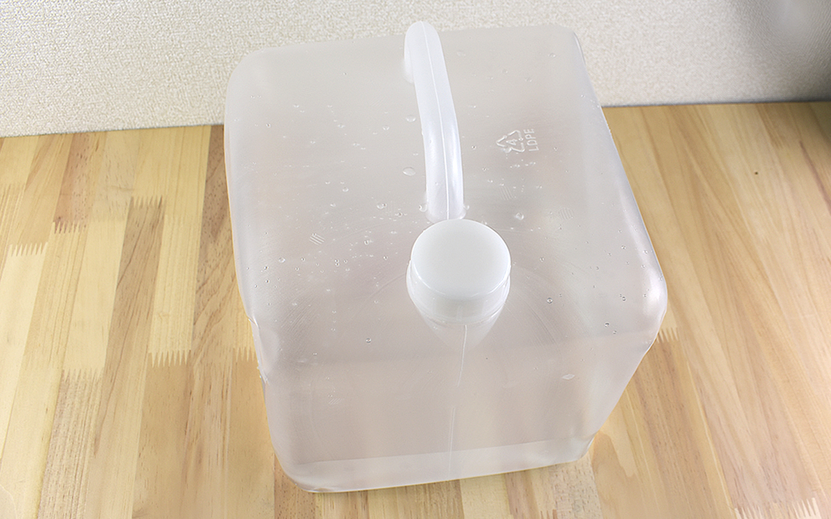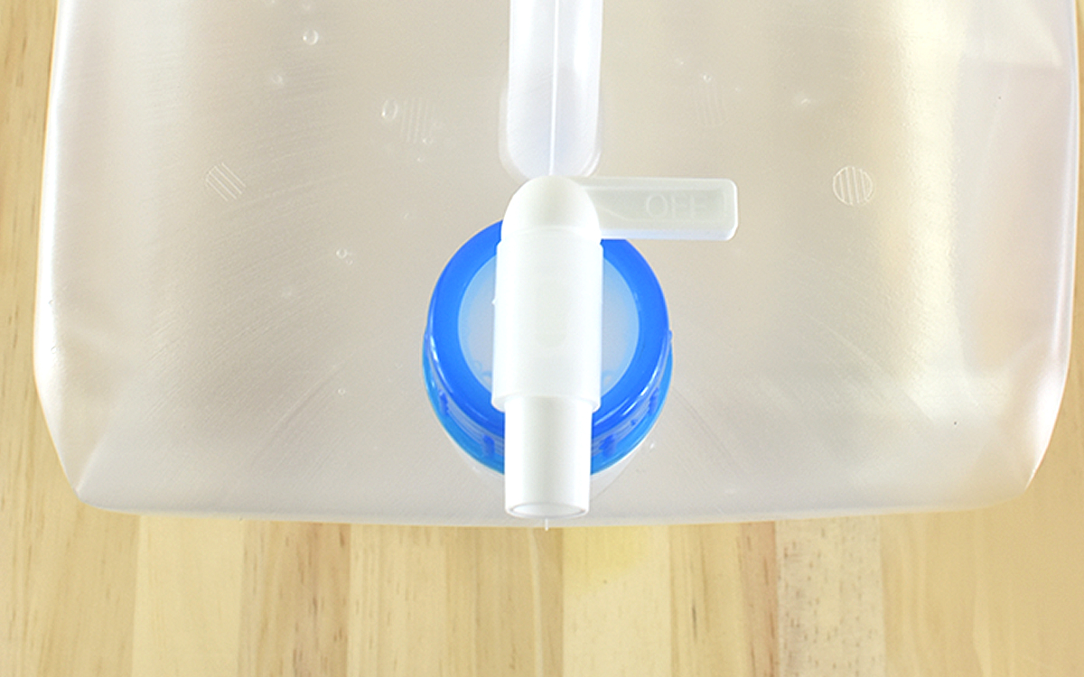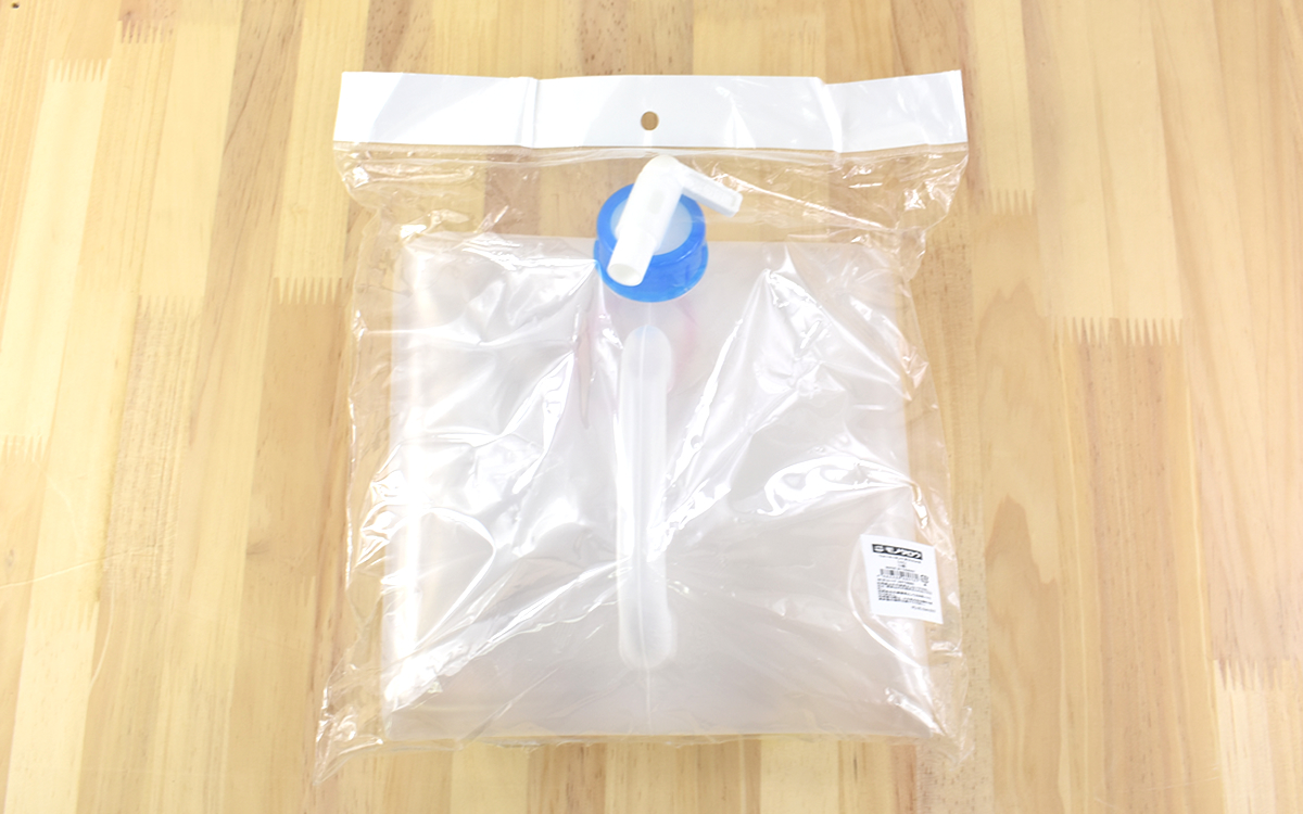 コックの部分を外してから赤いリングを引っ張れば、中に空気が入ってスムーズに開いてくれました。開いた状態のサイズは約225(幅)×225(奥行)×270mm(高さ)で、コンパクトですがしっかりと10Lの容量が入ります。ちなみに5L・20Lのタイプも用意されており、最も大きい20Lでも648円(税込)と格安。普通のポリタンクと比べてもお買い得なのではないでしょうか。