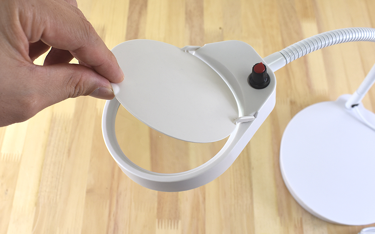 ミラーの上のカバーを外すと拡大鏡があります。レンズサイズは約90mmで、拡大鏡の倍率は全体が3倍率、小さな丸になっている部分が10倍率。レンズから対象物までの距離をうまく調整しないとピンぼけしますが、ピントを合わせればアームを固定できるので快適に見ることができますよ。