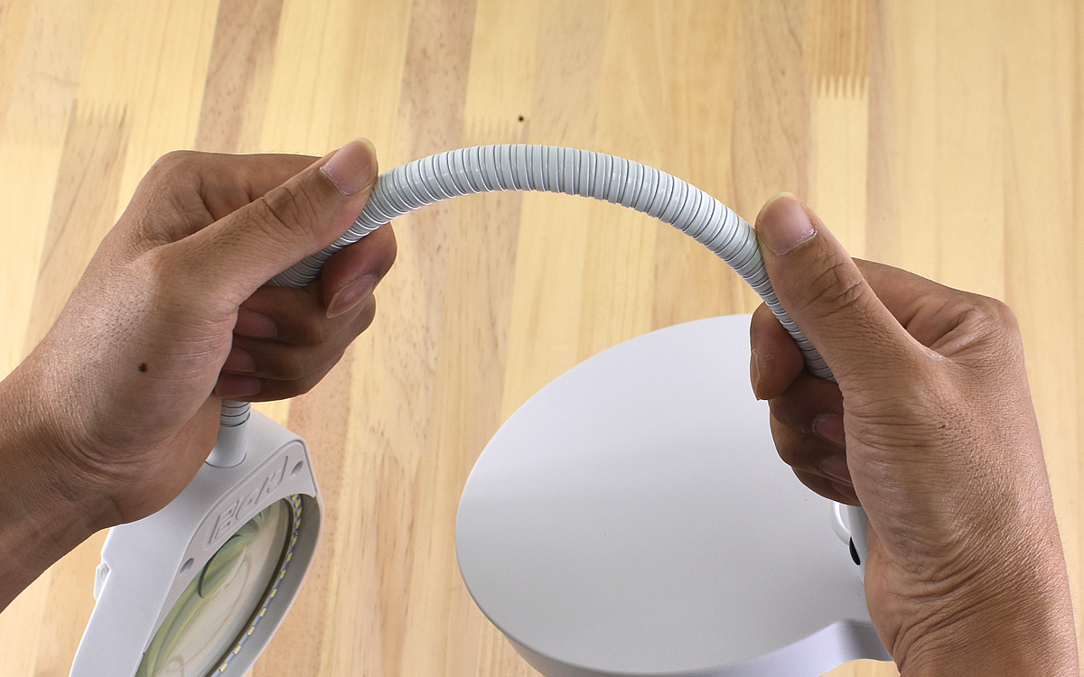 土台の大きさは168(幅)×168mm(奥行)ほどと、少し大きめのおかげでしっかりとした安定性のある拡大鏡。アームの長さは約360mmと、拡大鏡として使いやすい丁度良い長さです。アームは金属系の素材なので、曲げるときには程よい抵抗がありますが曲げにくいということはありません。むしろぐにゃぐにゃせず、設定した角度からブレない丈夫な作りが好印象。コードの長さが1.2mほどあるので、置く場所があまり制限されないのもうれしいポイントですね。